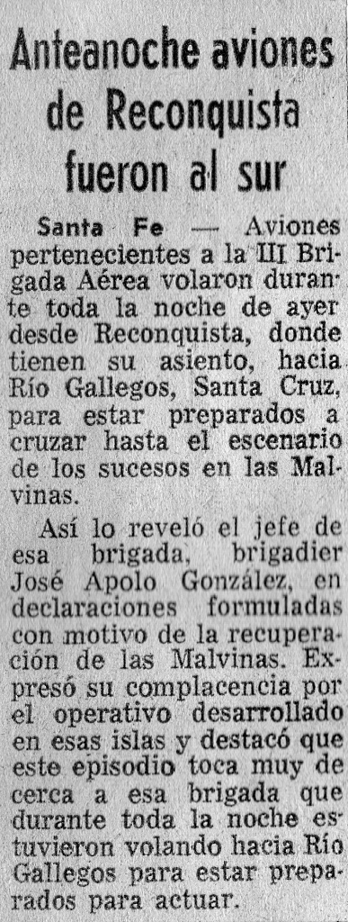 Reconocimientos: G. Fioni, R. Galván, G. Pavlovcic, S. Rivas, D. Rough, L. Satini y J. Zanela colaboraron con datos y referencias que sustentan esta investigación. Bibliografía consultada: Francisconi, Mario: “Malvinas: tributo entrerriano” (Argentina, 2012). Fuerza Aérea Argentina: “Historia de la Fuerza Aérea Argentina” (tomo VI, Argentina, 1998). Giménez, Isaías: “Malvinas: El Halcón Perdido” (Editorial Neyce, Argentina, 02/1987). Fuentes en Internet: Academia Nacional de la Historia, Apostadero Malvinas, Archive.org, Associated Press, Brit Modeller, diarios Ámbito Financiero, Clarín, La Nación, La Prensa y Tiempo Argentino (Buenos Aires), El Litoral, Escuela Normal “Miguel Ángel Giménez”, Fuerza Aérea Argentina, Google Earth, Helis, Naval History, ParaData/Airborne Forces Museum, The Royal Engineers Journal, UPI Archives y Wikipedia.