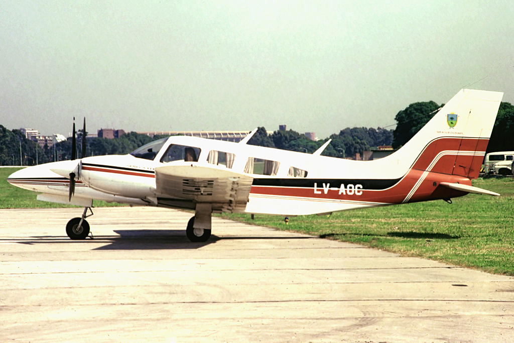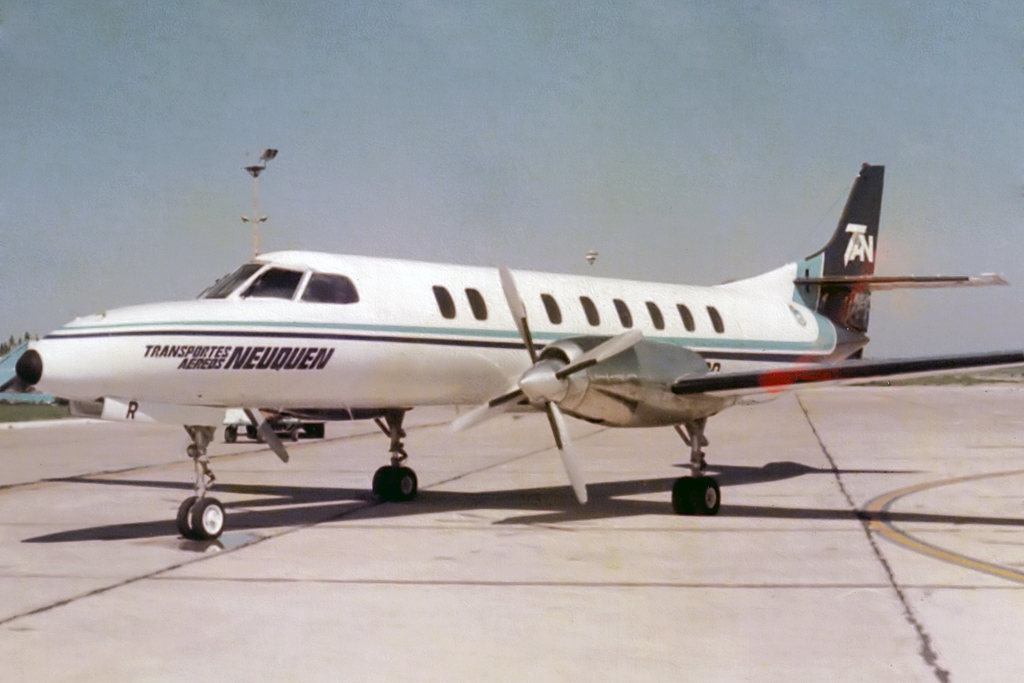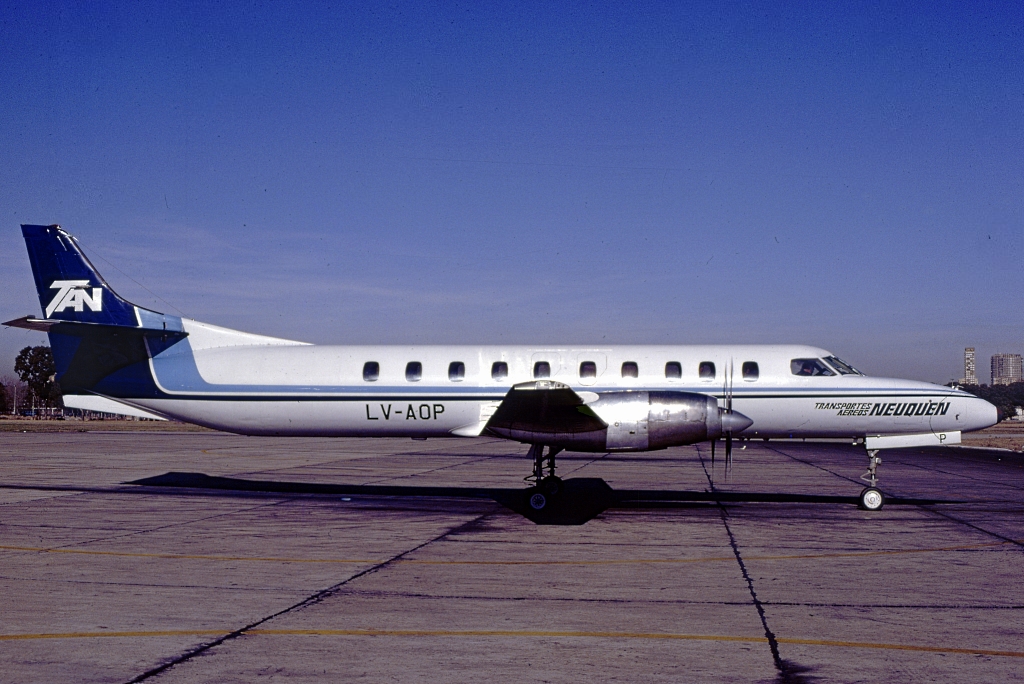 Una de las dos aeronaves de mayor porte en esta serie, el Swearingen Metro III LV-AOP operó con la aerolínea regional provincial, Transportes Aéreos Neuquén (TAN). Si bien sus servicios generalmente se restringían a destinos de esa propia provincia de la Patagonia y Comahue, en ocasiones excepcionales se lo pudo ver operan en la Capital Federal. Esta imagen, en particular, data de junio de 1988 y muestra la aeronave iniciando el rodaje hacia la cabecera activa desde la plataforma comercial del Aeroparque «Jorge Newbery». En segundo plano, se distinguen un Boeing 727 de Aerolíneas Argentinas y dos BAC 111 más un McDonnell Douglas MD-80 de Austral Líneas Aéreas.
