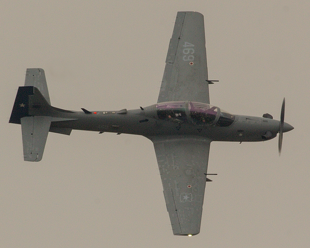 El Embraer EMB-314 469 fue el primer avión de la fija de la FACH en realizar una demostración en vuelo durante la tarde de una jornada meteorológicamente poco amigable (foto: Carlos Ay).
