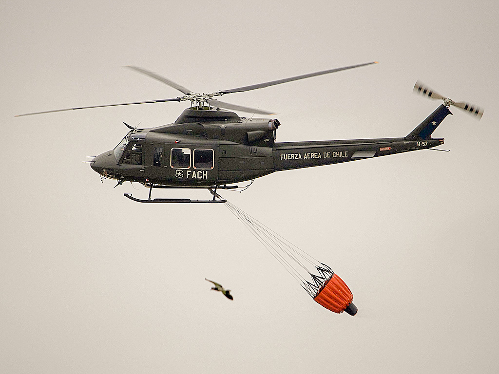 Bell 421EP H-57 demostrando sus capacidades de lucha contra incendios forestales con un helibalde Bamby Bucket (foto: Luis Quintana Aránguiz).
