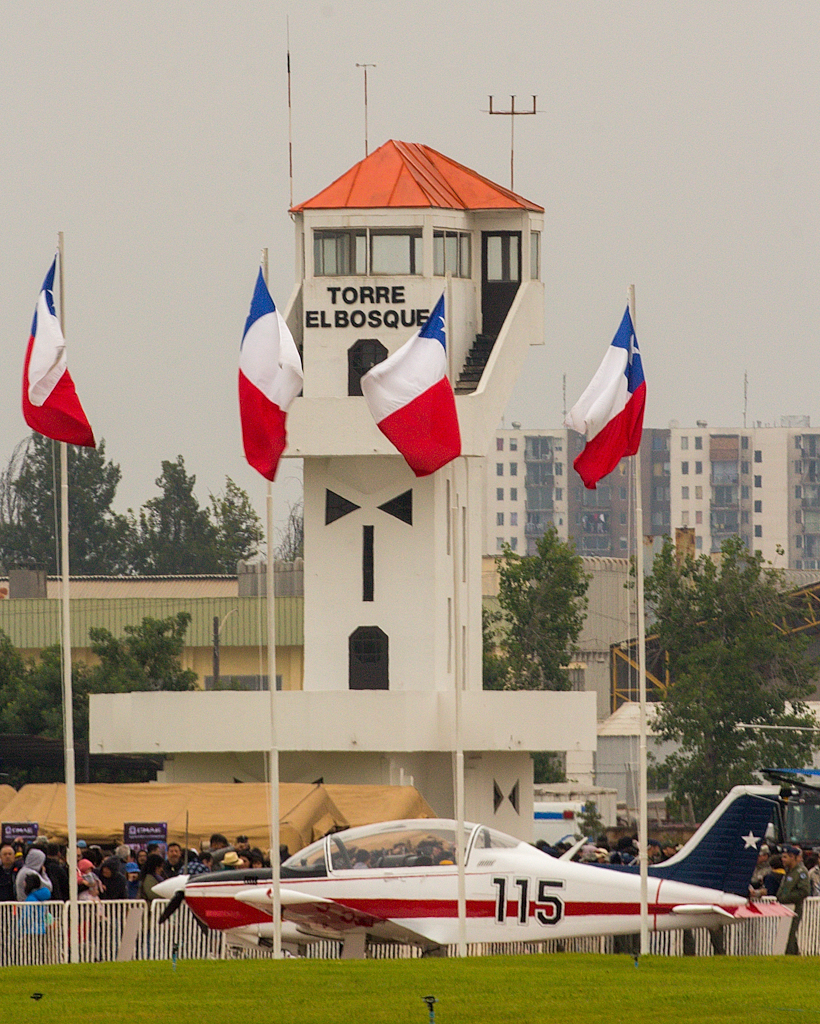El T-35 Pillán matrícula 115 enmarcado por banderas chilenas y la distintiva torre de control de la base aérea (foto: Carlos Ay).