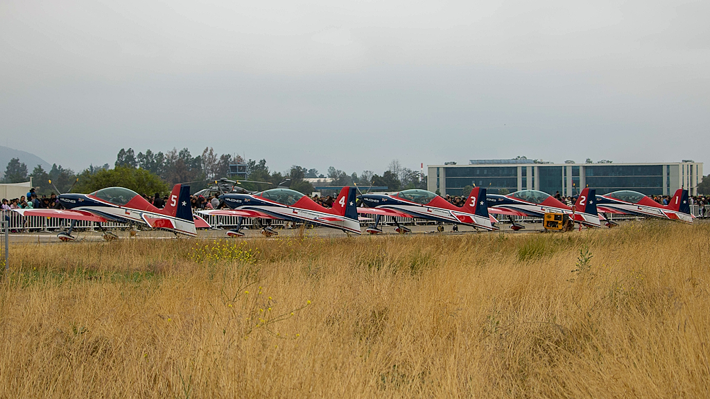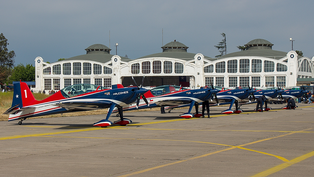 Las aeronaves de la escuadrilla acrobática de la FACH descansan en la plataforma de vuelo a la hora de cierre. Al fondo, el distintivo y centenario hangar blanco que actualmente emplea ENAER (foto: Carlos Ay).