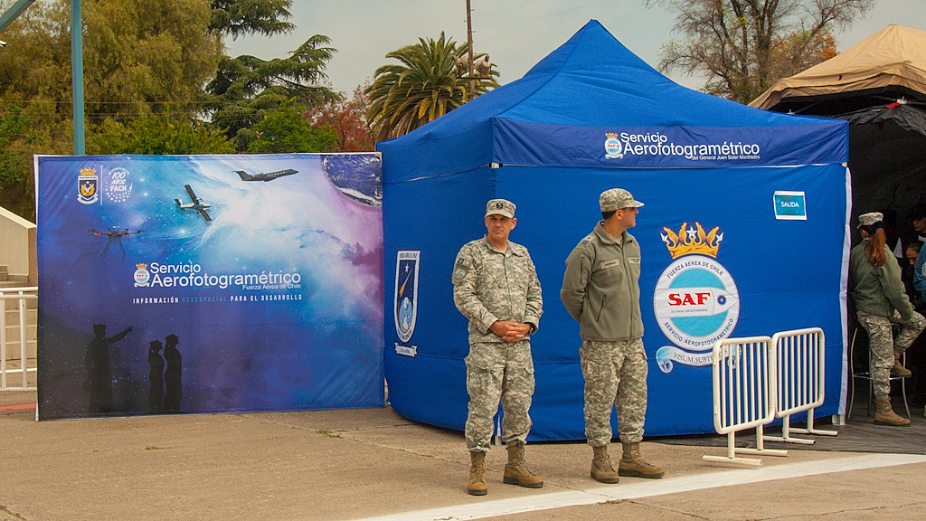 Stand institucional del Servicio Aerofotogramétrico de la FACH, que se promocionaba con el slogan «información geoespacial para el desarrollo» y un amplio espectro de medios específicos de su función (foto: Carlos Ay).