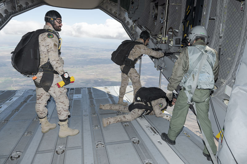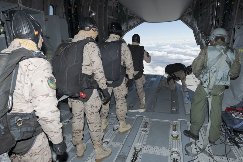 Mientras se desarrollaba la maniobra con los VAMTAC los 35 saltadores del EADA han ido acercándose a la aeronave con el equipo de salto preparado. No ha pasado ni un minuto desde la bajada del último vehículo cuando todos los paracaidistas comienzan a acceder al T.23 por la rampa trasera. Los Controladores de Combate (CCT) en el aeródromo de Ablitas comunican que tanto el viento como el techo de nubes están dentro de los límites de salto, ya no hay marcha atrás. A los pocos minutos el T.23 comienza a carretear por la plataforma Sur de la Base de Zaragoza camino de la cabecera de la pista 30L.