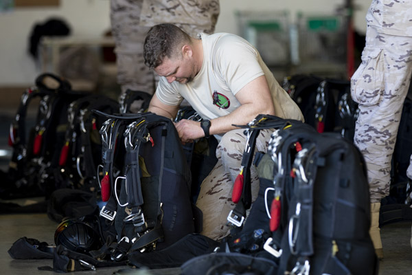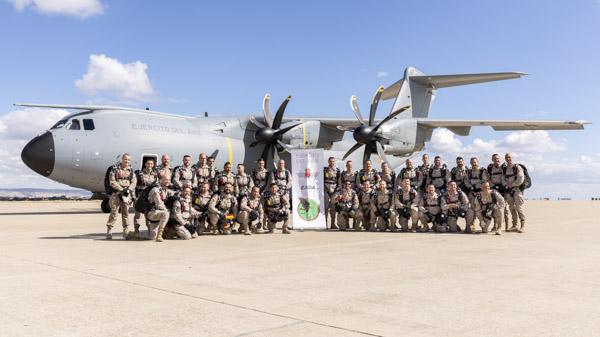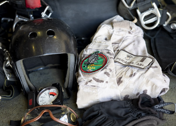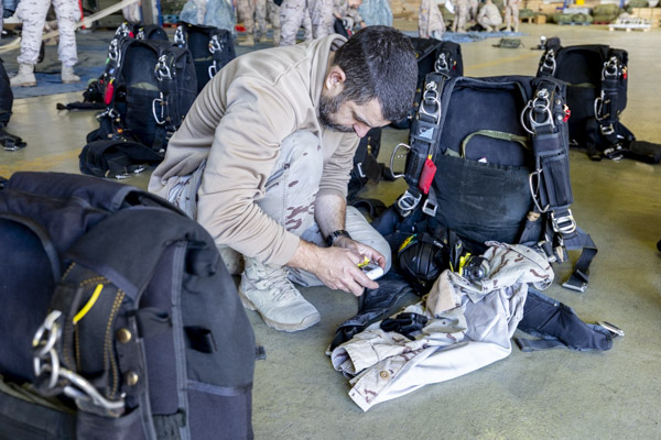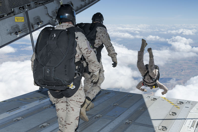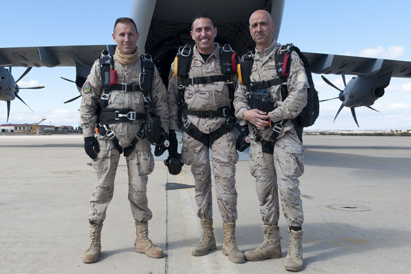 En el hangar de cargas del EADA la actividad es frenética. Mientras la sección de automóviles está alineando varios URO VAMTAC (Vehículo de Alta Movilidad Táctico) tras la rampa del avión, un grupo de 35 paracaidistas están ultimando la preparación sus equipos. El día de hoy presenciará el primer sato paracaidista en la historia del A400 en España. Los saltos serán en modalidad de apertura manual, por encima de los 10.000 pies siempre y cuando el techo de nubes en la Zona de Salto (DZ, Drop Zone) lo permita. Los 35 elegidos atesoran un buen número de saltos a sus espaldas, oficiales, suboficiales y tropa experimentados, hoy no hay sitio para los recién llegados a la unidad.