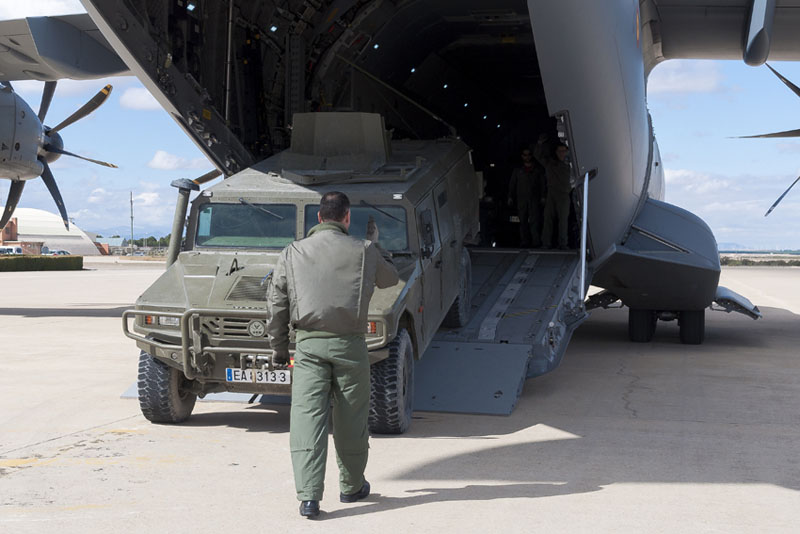En apenas dos minutos la rampa del avión se cierra y el personal del Ala 31 comienza la secuencia de puesta en marcha del avión. Los cuatro motores rugen con fuerza y todo el personal se retira del perímetro de la aeronave. A los pocos minutos se vuelve a abrir la rampa y el supervisor de carga desciende por la misma. Comienza la operación de desembarque con motores en funcionamiento. Las indicaciones del supervisor son claras y rápidas, los conductores bajan por la rampa a una velocidad notablemente mayor que la habitual en un T.10. El nuevo Dumbo es más grande, hay más espacio, hay más seguridad, en definitiva, la velocidad se incrementa y esto en situaciones hostiles marca la diferencia entre el éxito y el fracaso, el EADA lo sabe bien.