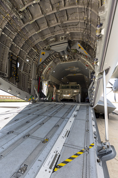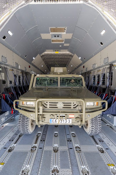 En primer lugar se van a realizar pruebas de embarque y desembarque de vehículos usando la rampa de la bodega de carga del T.23. Los VAMTAC siguen las instrucciones del supervisor de carga y van accediendo uno a uno al interior de la aeronave. Las diferencias con el T.10 son evidentes, todo el personal presente comprueba que la capacidad del T.23 supera a la del venerable Hércules. Las dimensiones de la bodega, la rampa y los modernos sistemas de la aeronave, todo hace que la operación se realice con absoluta normalidad y a una velocidad notable.