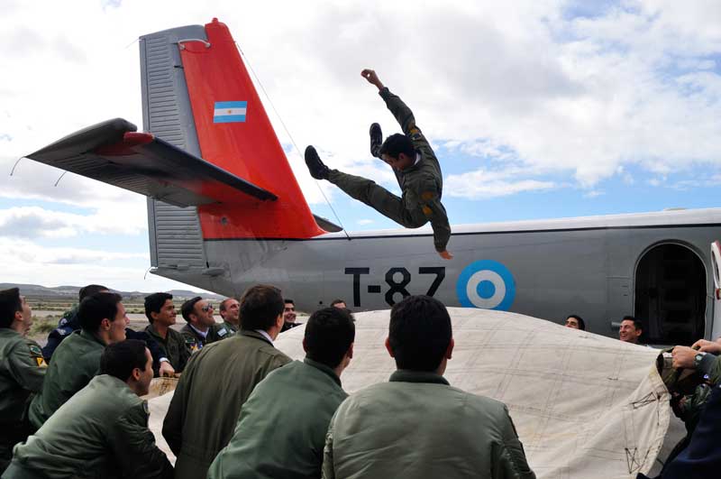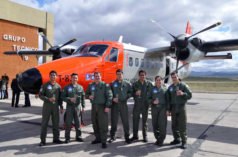 Paralelamente, una conocida silueta de los cielos patagónicos se recortaba en los cielos y sobrevolaba a los presentes, se trataba del De Havilland Canada DHC-6-200 Twin Otter T-87, del Escuadrón VII de Transporte, que completaba su «Vuelo Solo» con una nueva camada de «Águilas Transporteras”. Estos, completaban así, su Habilitación como Etapa 2 en dicho Sistema de Armas. Ya detenida completamente la marcha de la aeronave, frente al Hangar del Grupo Técnico 9 (GT9), la tripulación, recibió uno por uno la tradicional «manteada», al igual que el habitual brindis al pie de la aeronave junto al JEMGFAA, instructores y personal de la Unidad.