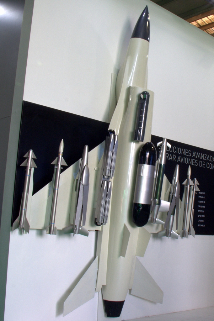 En una posición dominante del stand, se apreciaban réplicas a escala real de los misiles aire-aire infrarrojo Python-5 (también con aplicaciones de defensa aérea) y de radar activo I-Derby, dotado de lo que el fabricante define como un “innovador buscador de radiofrecuencia […] combinado con un aumento único del rendimiento cinemático, con un alcance de hasta 100 km {en la versión] I-Derby ER”.
