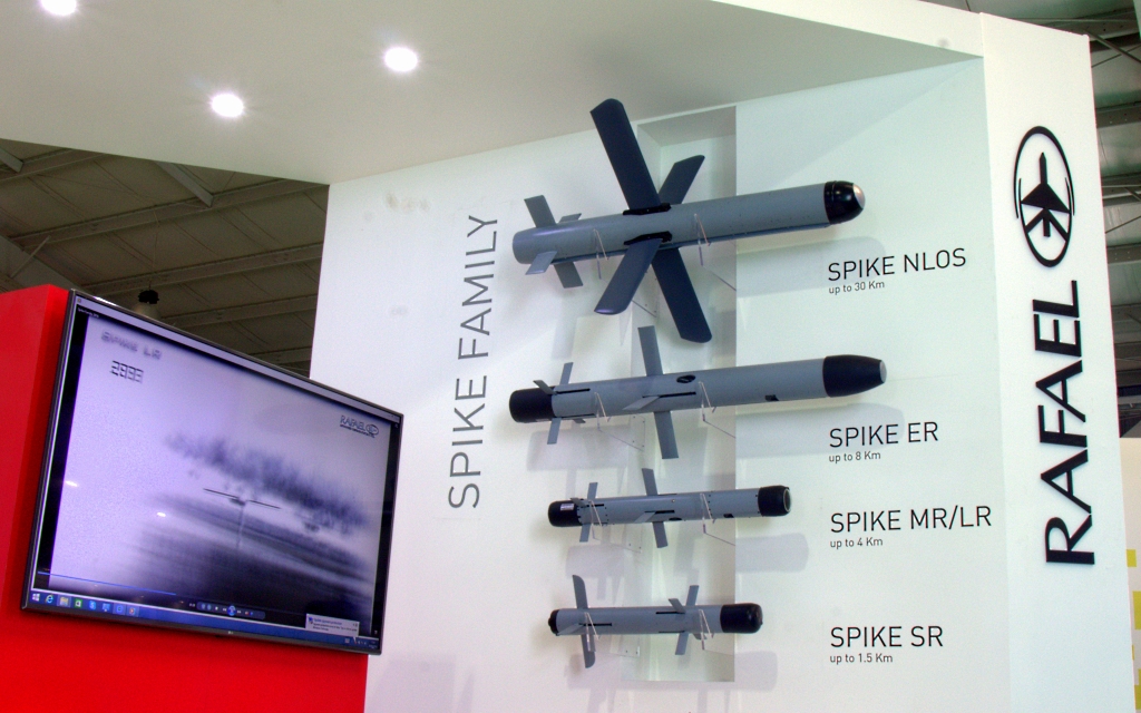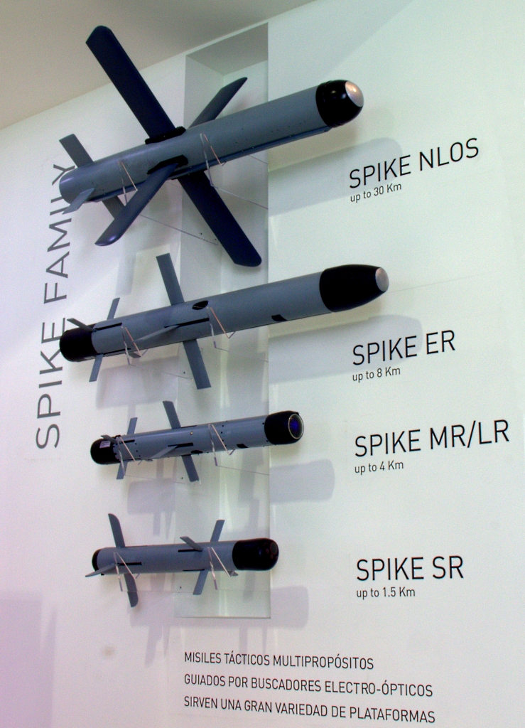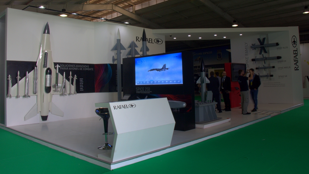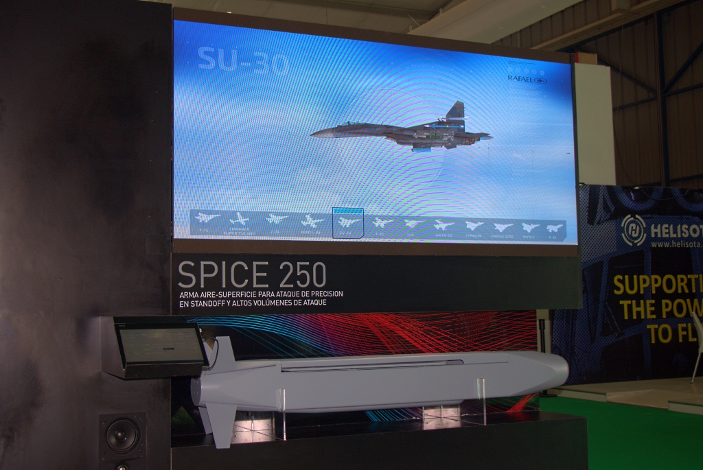 También se mostraban vistosamente el kit de guiado de bombas Spice 250, dotado de “tecnología exclusiva para [lograr] impactos precisos a distancias de hasta 100 km” y los misiles electroópticos tácticos de la familia Spike (SR, LR / MR, LR2, ER, NLOS), con alcances de entre 1,5 y 30 km.