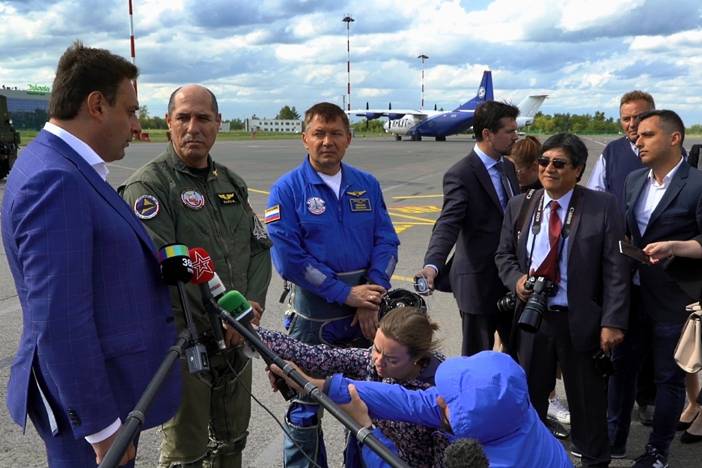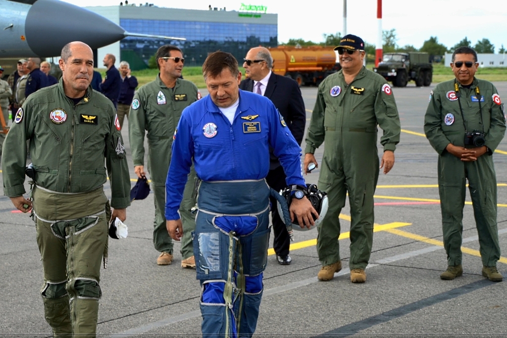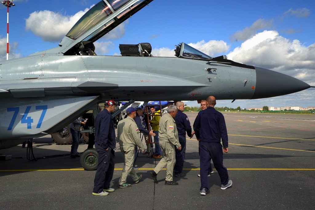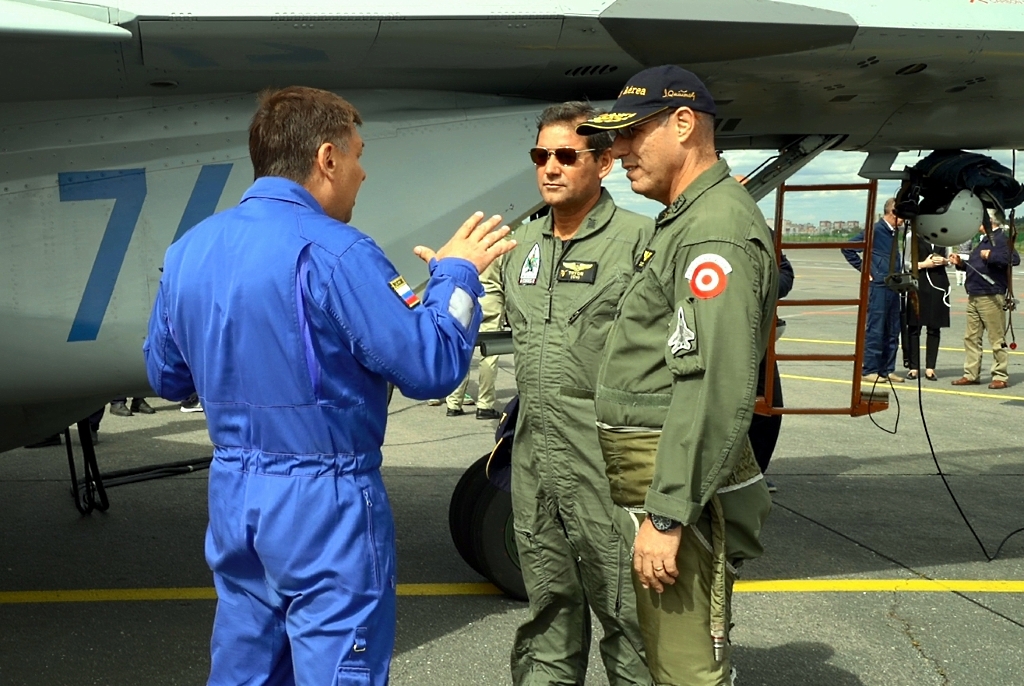Bien dispuesto a atender a los medios periodísticos presentes, el líder de la delegación peruana confirmó la extensa relación que la FAP tiene con la industria aeroespacial rusa al afirmar que la institución «viene operando aviones de fabricación rusa desde hace 40 años» y que «hace más de 20 años que tenemos los aviones MiG-29».
