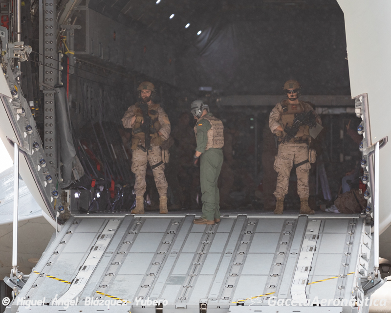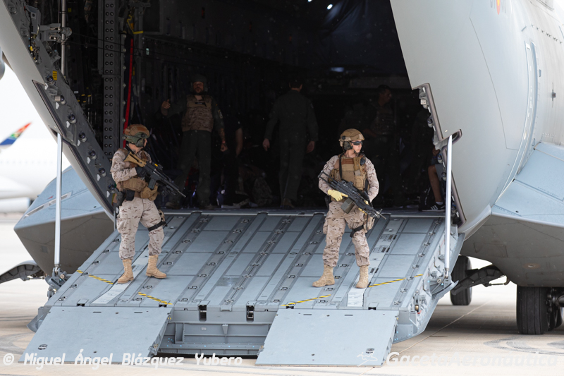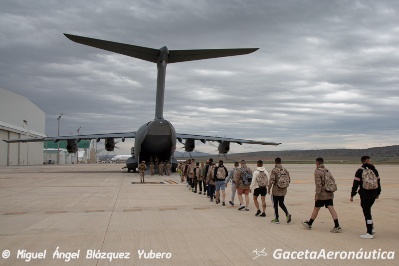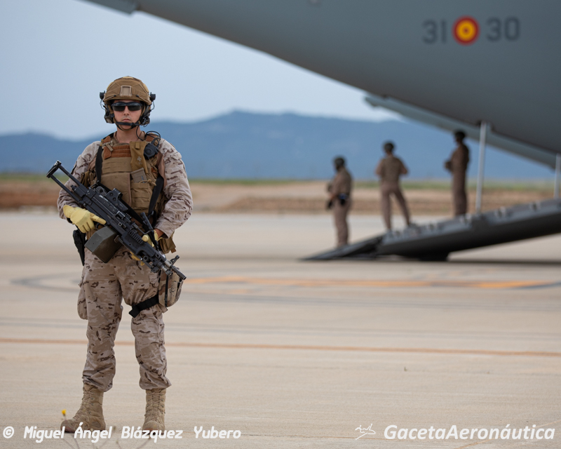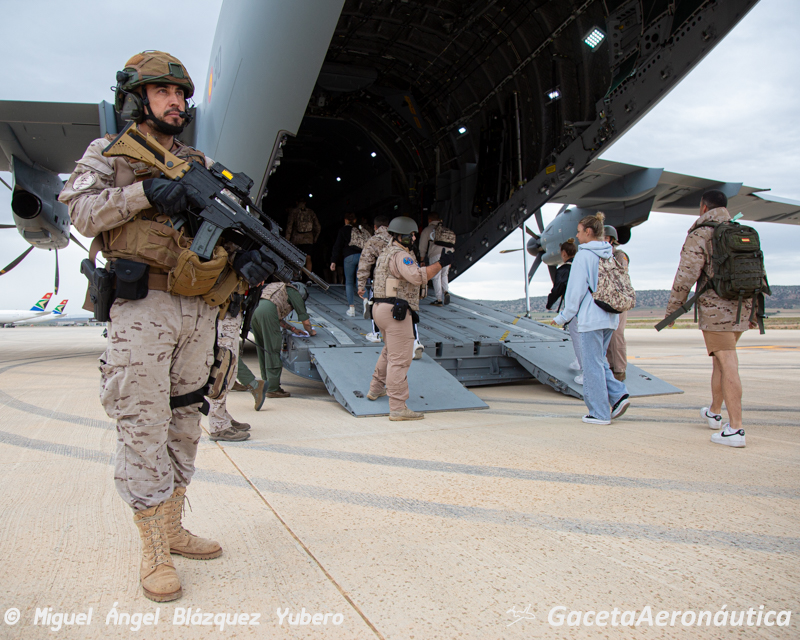 El colofón en este tipo de operaciones es la evacuación por vía aérea. En esta ocasión dos A400 del Ala 31 tras una navegación a baja cota han aterrizado en el Aeropuerto de Teruel a las 17:30 hora local. Una vez posicionados en plataforma han abierto las rampas traseras y los equipos Air Mobile Protection Team (AMPT) del EADA que iban en su interior han descendido para mantener un perímetro de seguridad alrededor de la aeronave.