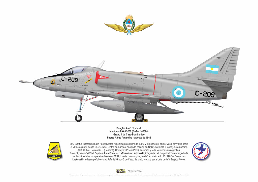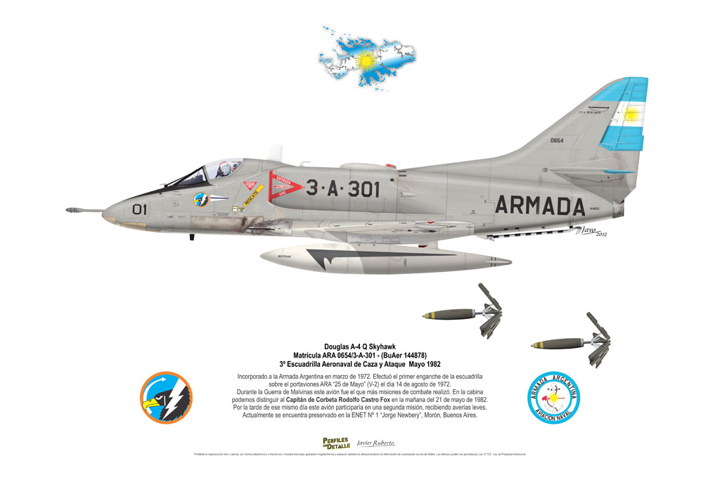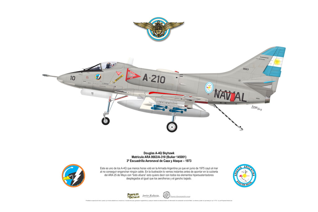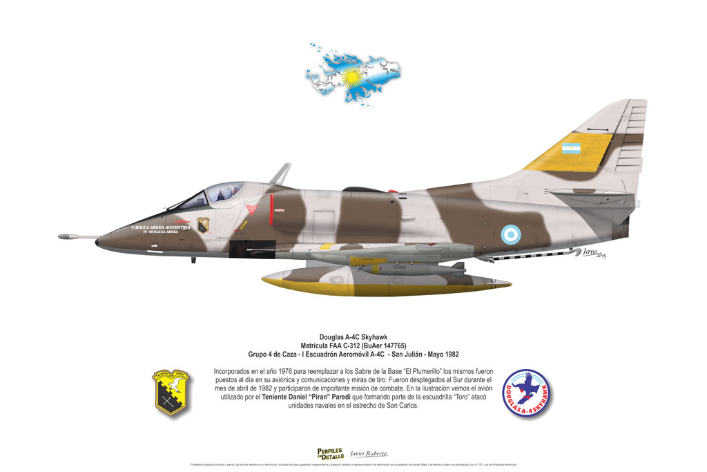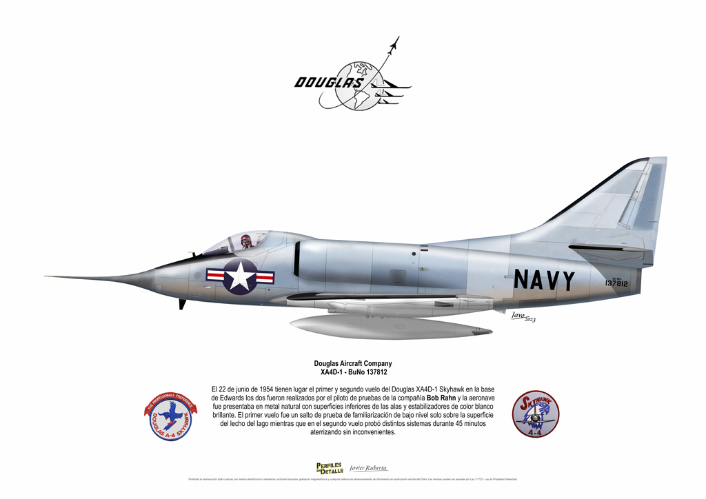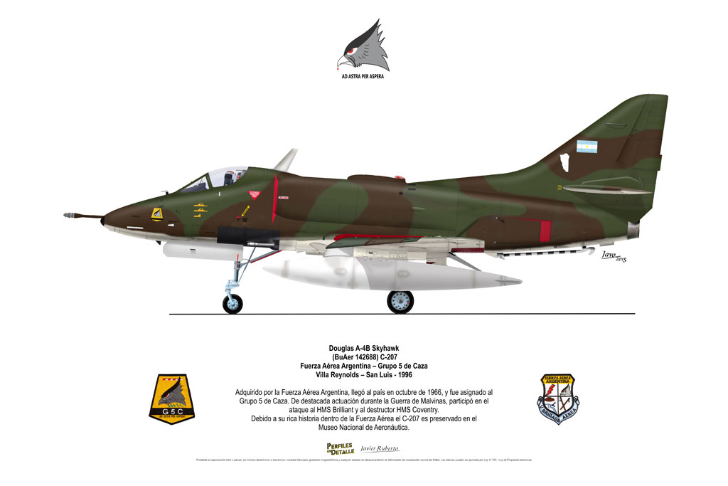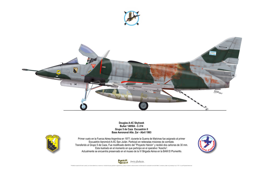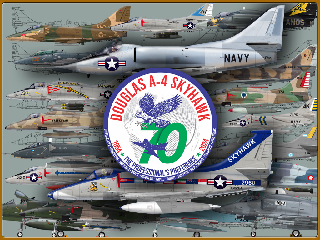 El Douglas A-4 Skyhawk, avión de ataque con capacidad para operar desde portaaviones, fue diseñado por Edward H. Heinemann en la década del ´50 para la USN (United States Navy) y la USMC (United States Marine Corps). El 22 de junio de 1954 se registró su primer vuelo. Mientras que el último aparato producido salió de la fábrica de Douglas Aircraft Co. Inc., ubicada en Long Beach-California, el 27 de febrero de 1979. En este periodo el total de aviones construidos fue de 2.960 unidades.