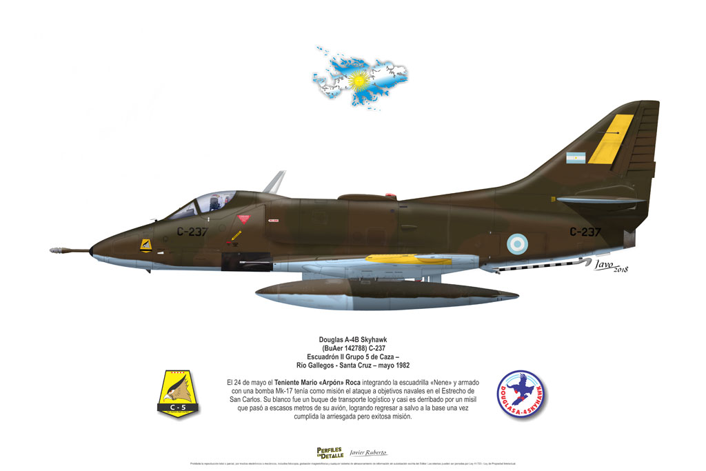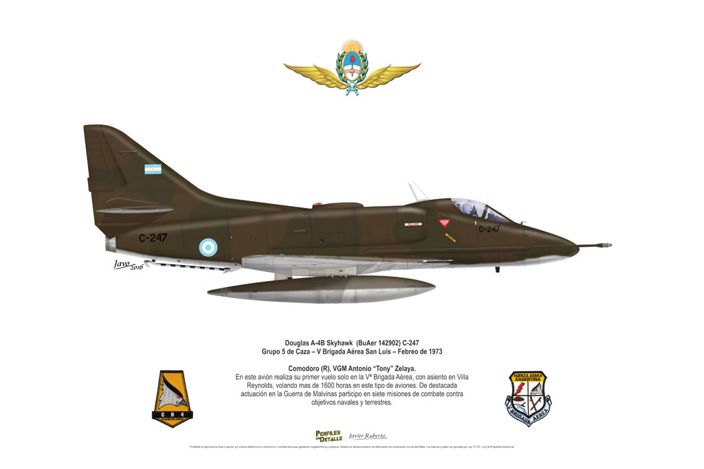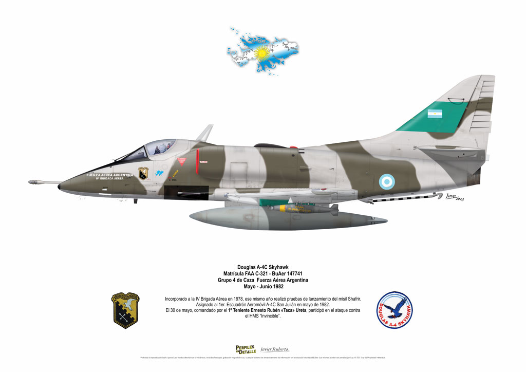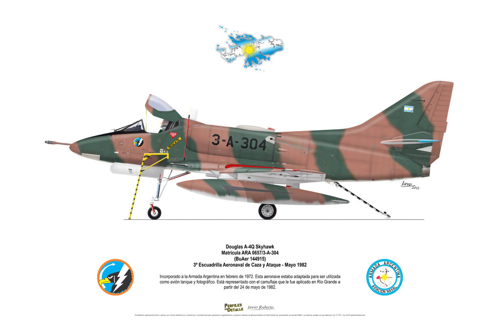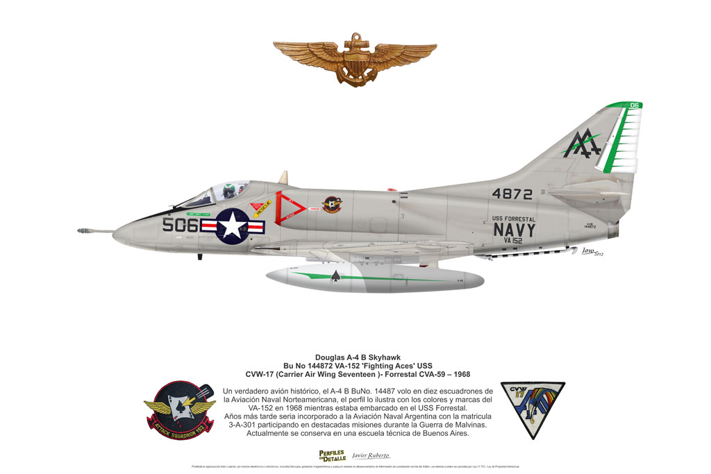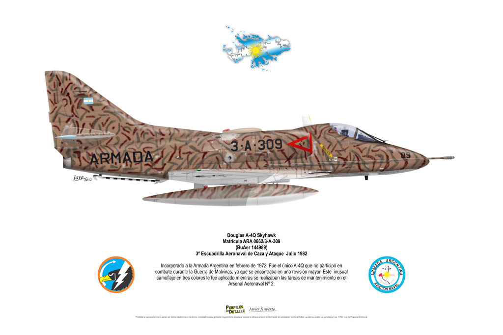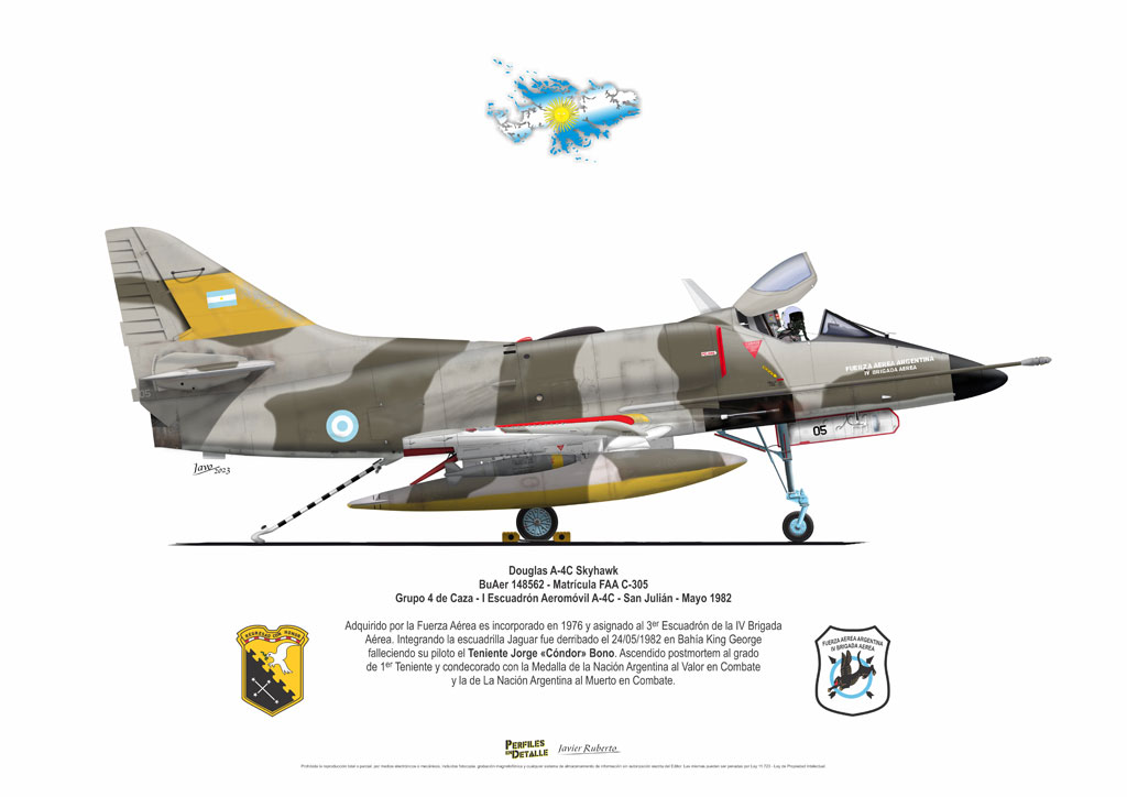 El Douglas A-4 Skyhawk, avión de ataque con capacidad para operar desde portaaviones, fue diseñado por Edward H. Heinemann en la década del ´50 para la USN (United States Navy) y la USMC (United States Marine Corps). El 22 de junio de 1954 se registró su primer vuelo. Mientras que el último aparato producido salió de la fábrica de Douglas Aircraft Co. Inc., ubicada en Long Beach-California, el 27 de febrero de 1979. En este periodo el total de aviones construidos fue de 2.960 unidades.