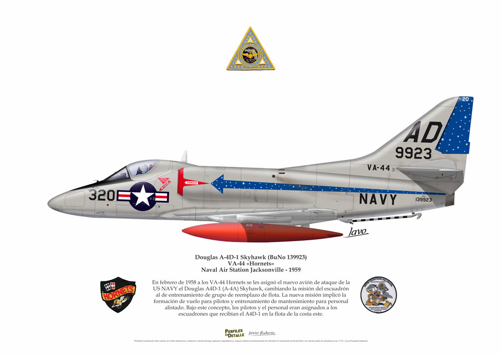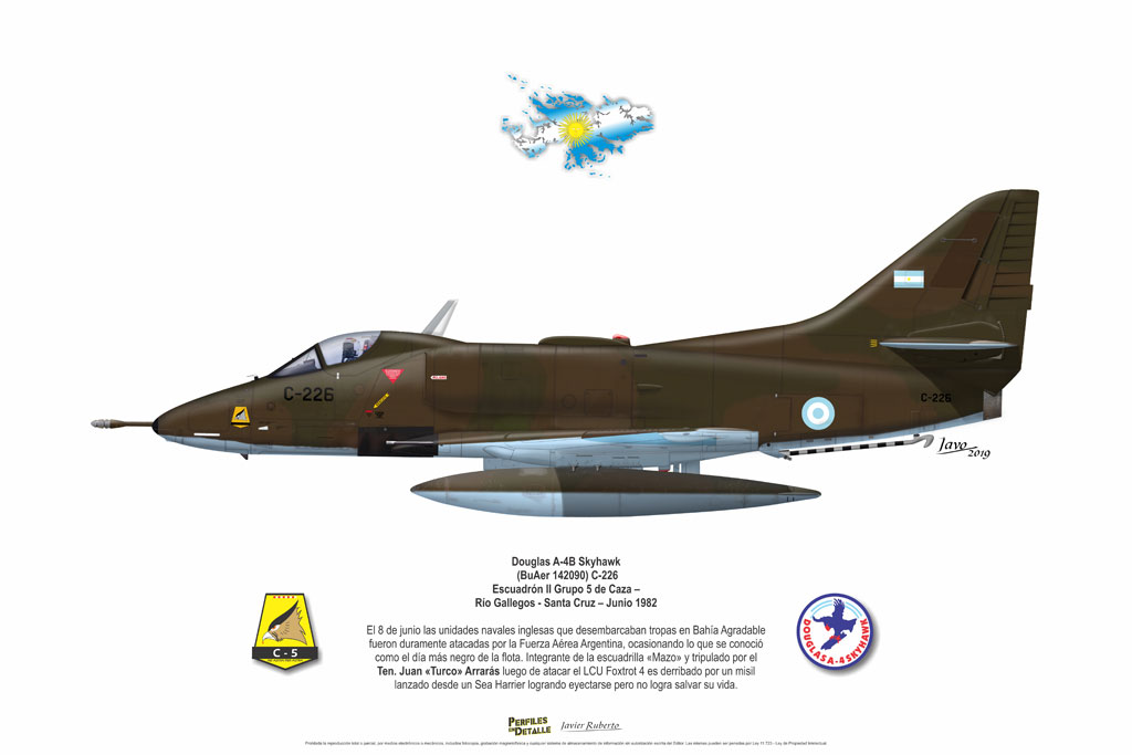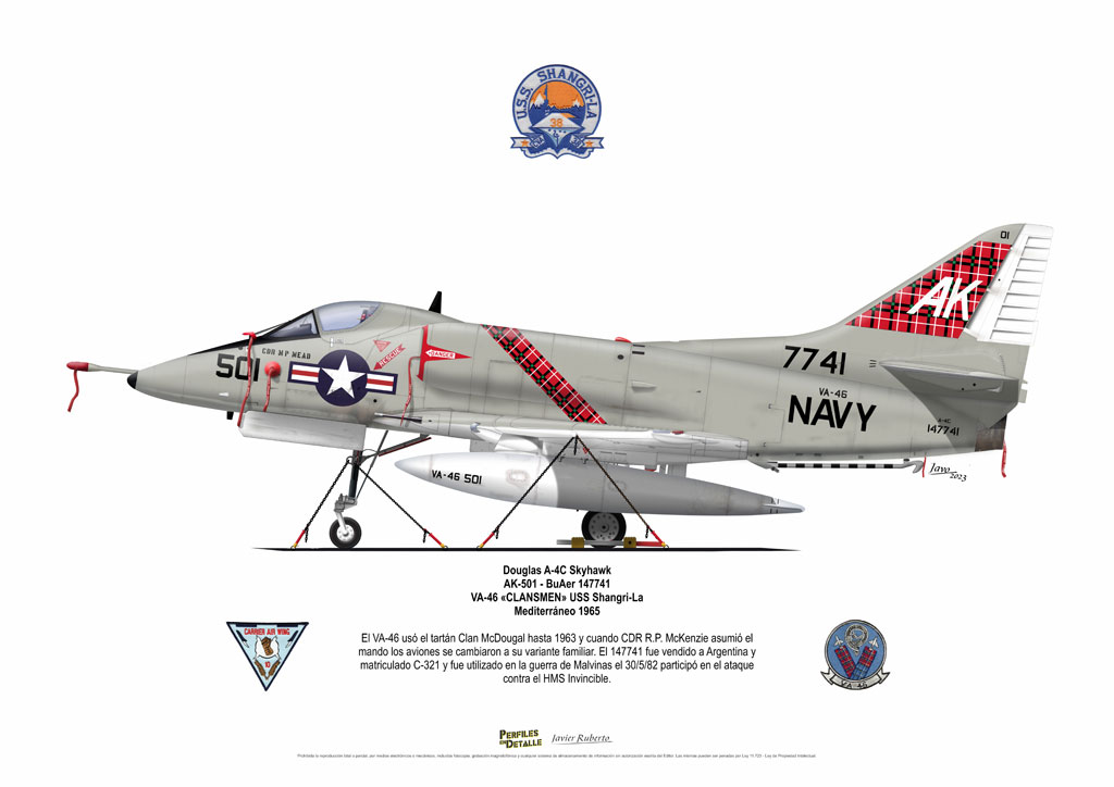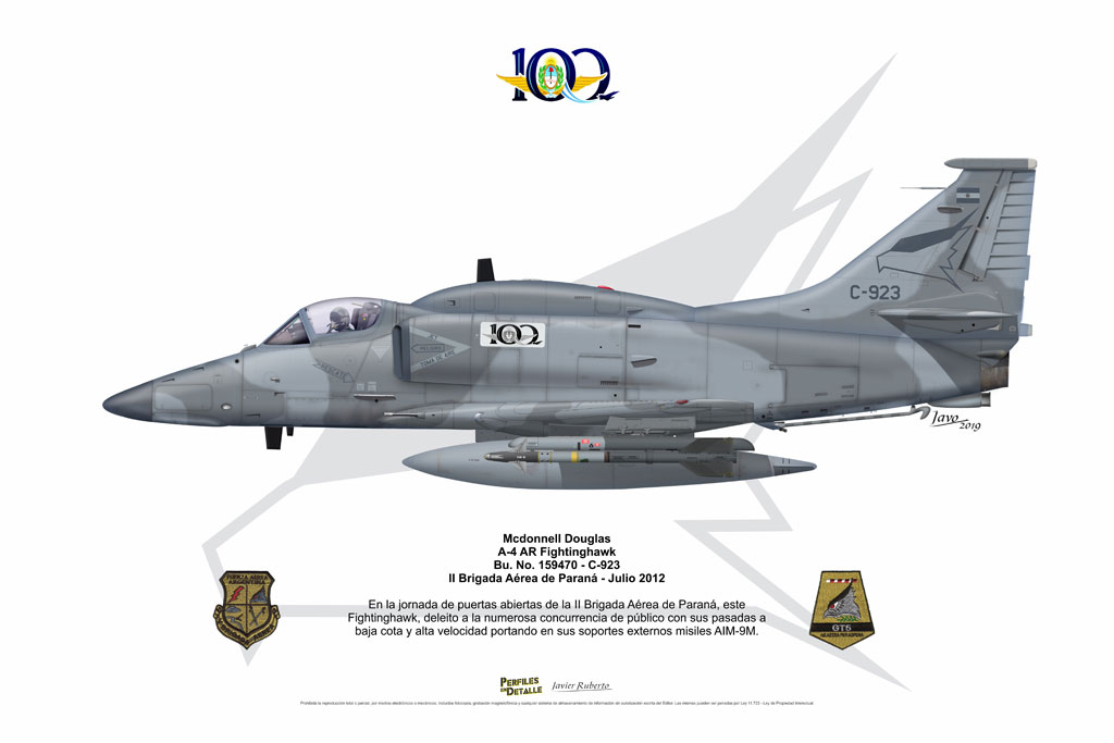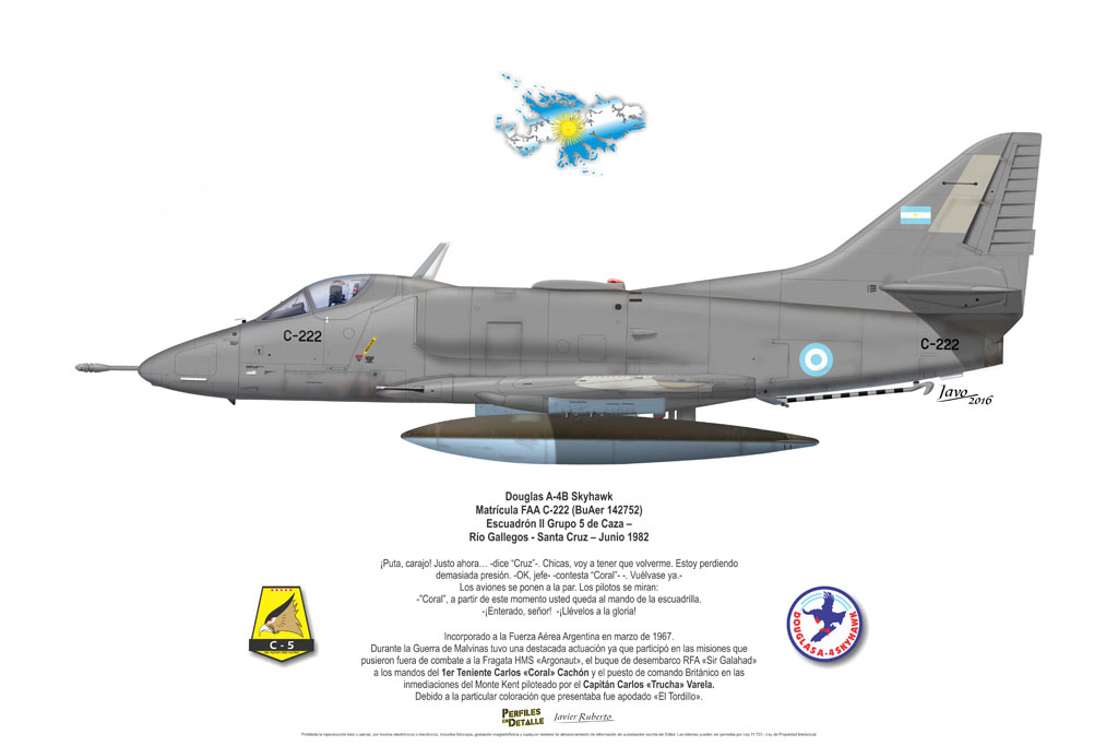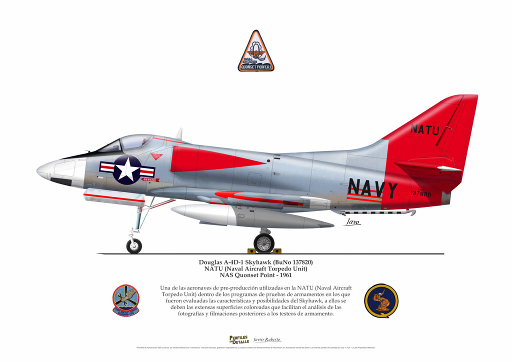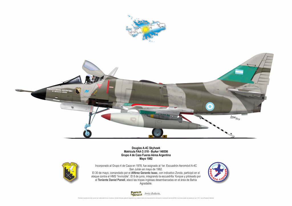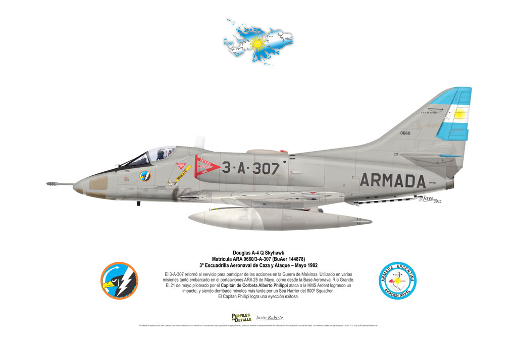El Douglas A-4 Skyhawk, avión de ataque con capacidad para operar desde portaaviones, fue diseñado por Edward H. Heinemann en la década del ´50 para la USN (United States Navy) y la USMC (United States Marine Corps). El 22 de junio de 1954 se registró su primer vuelo. Mientras que el último aparato producido salió de la fábrica de Douglas Aircraft Co. Inc., ubicada en Long Beach-California, el 27 de febrero de 1979. En este periodo el total de aviones construidos fue de 2.960 unidades.