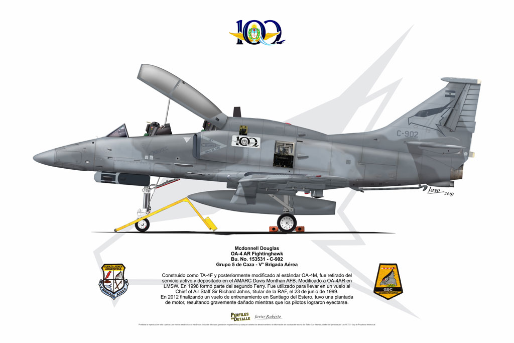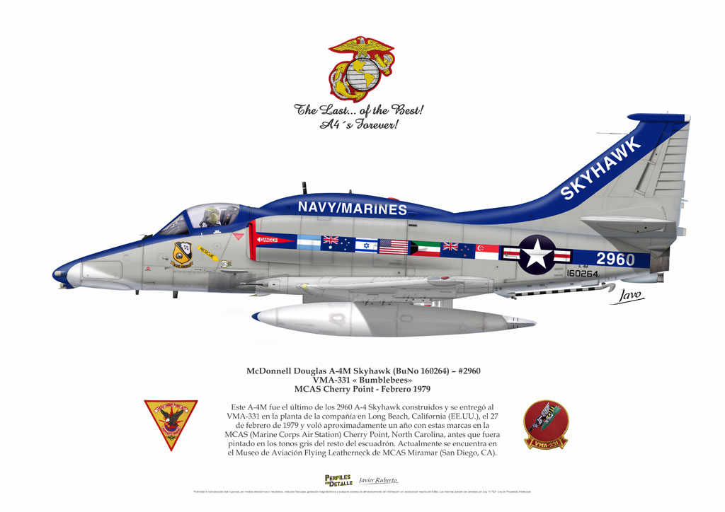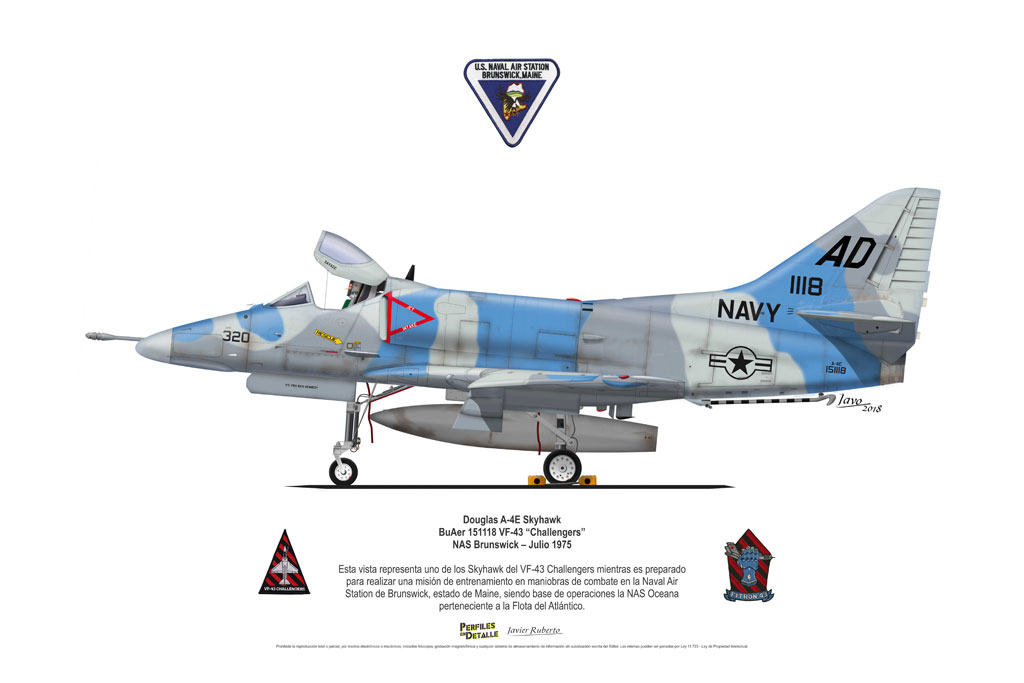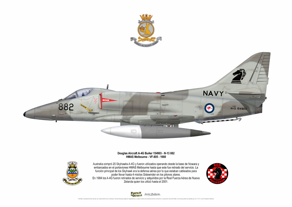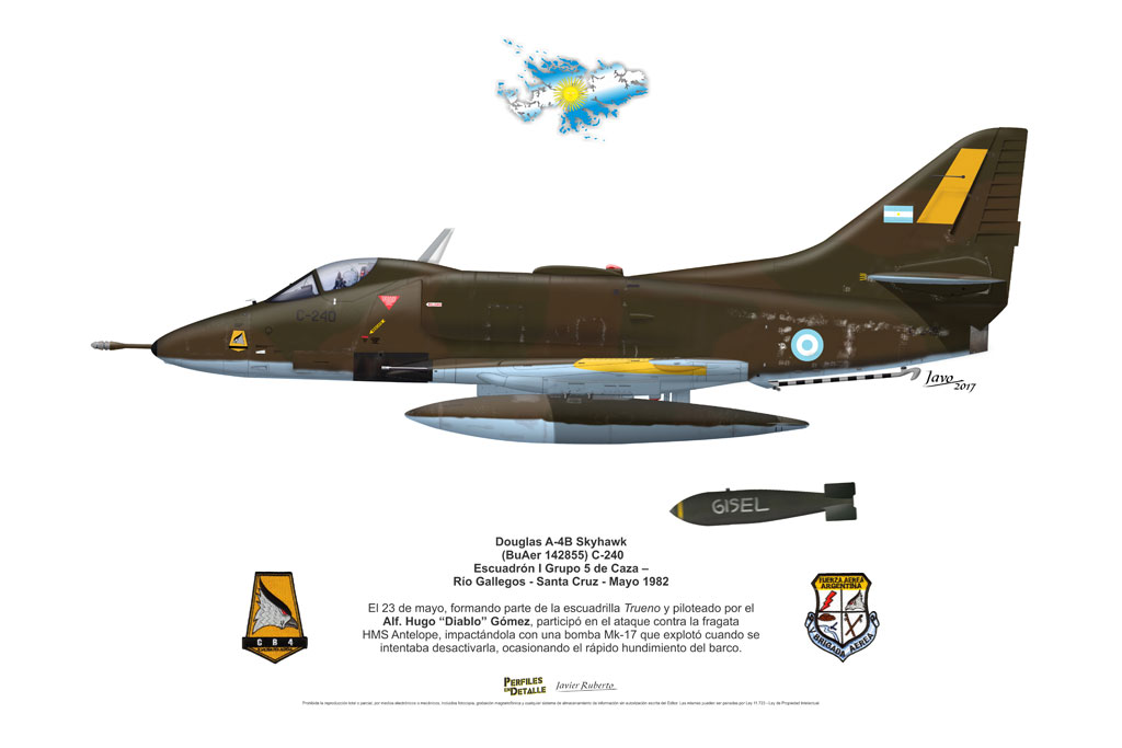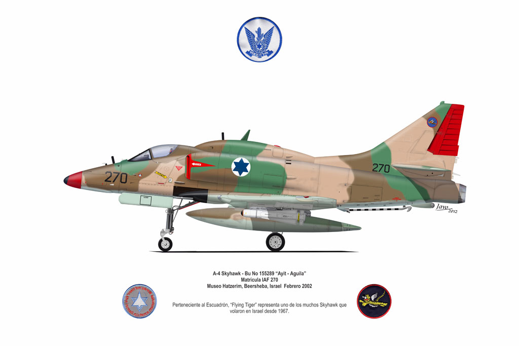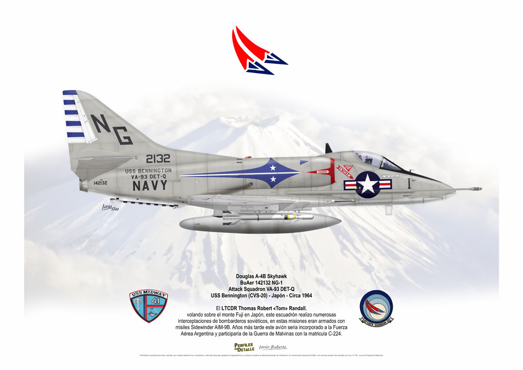 El Douglas A-4 Skyhawk, avión de ataque con capacidad para operar desde portaaviones, fue diseñado por Edward H. Heinemann en la década del ´50 para la USN (United States Navy) y la USMC (United States Marine Corps). El 22 de junio de 1954 se registró su primer vuelo. Mientras que el último aparato producido salió de la fábrica de Douglas Aircraft Co. Inc., ubicada en Long Beach-California, el 27 de febrero de 1979. En este periodo el total de aviones construidos fue de 2.960 unidades.