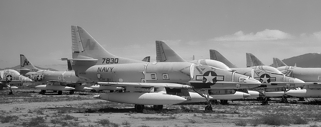 Vista general de un grupo de Skyhawks A-4C de la Armada y el Cuerpo de Marines de EE. UU. almacenados en la Base Aérea Davis-Monthan (Arizona), 23/09/1974. De allí vendría el futuro C-322 argentino (foto: eLaReF).