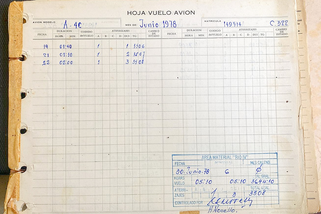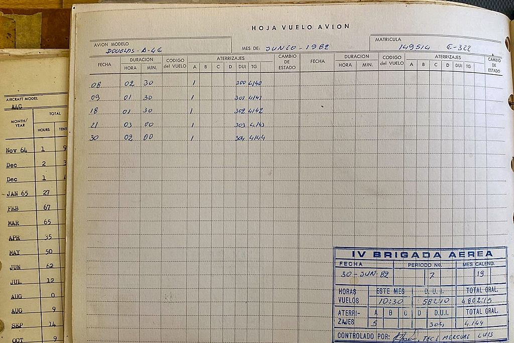 Página de la bitácora del C-322 que muestra su actividad de vuelo de 06/1982 (foto: Departamento de Investigaciones Históricas del Museo Nacional de Aeronáutica vía Walter Marcelo Bentancor).