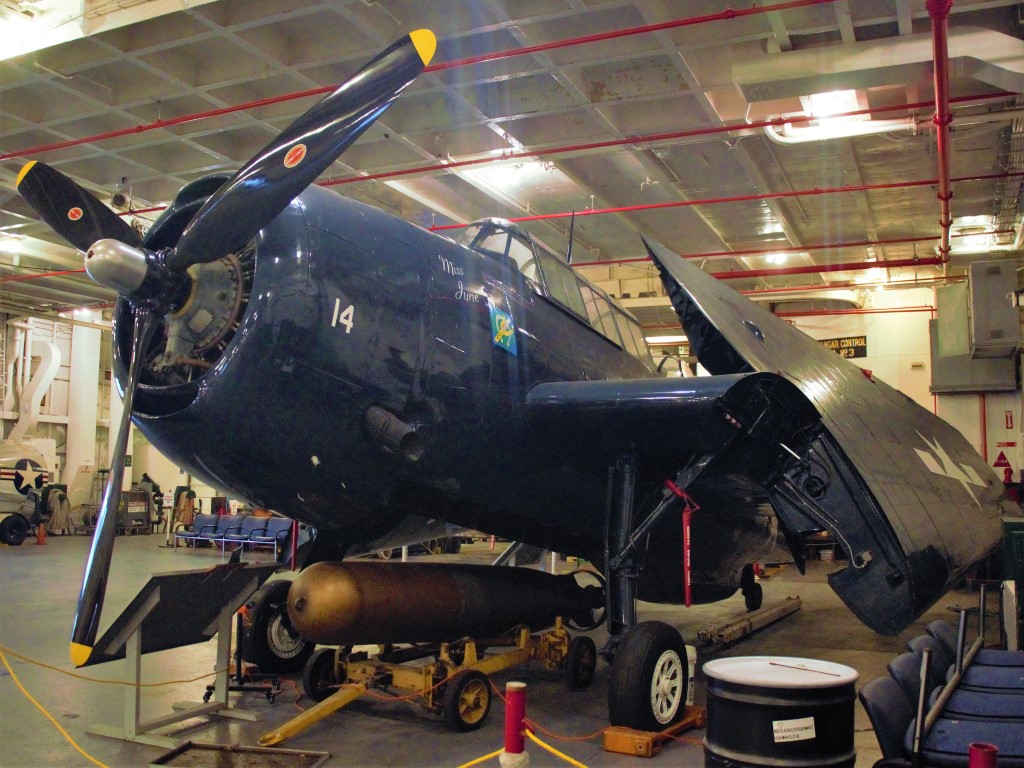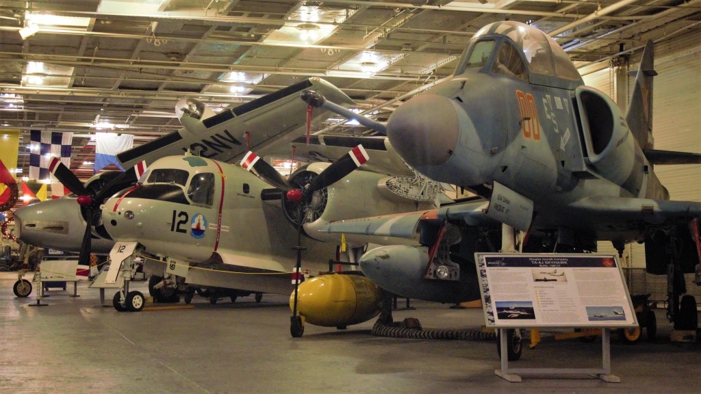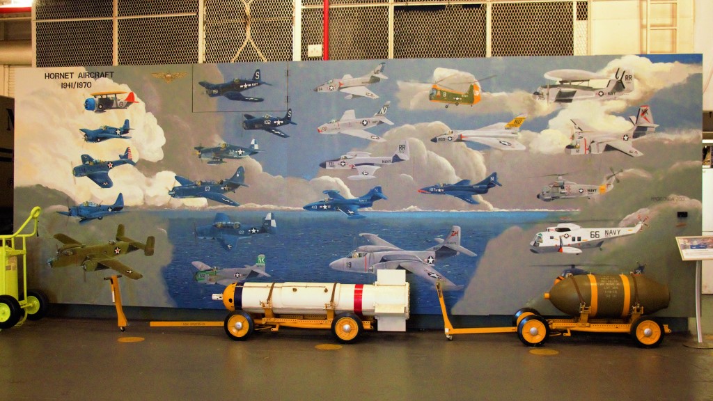 Las aeronaves en exhibición constituyen una muestra representativa de la evolución aeronaval norteamericana desde la Segunda Guerra Mundial hasta la Guerra del Golfo y los tipos de aeronaves que operaron desde el USS Hornet a lo largo de su multifacética carrera como portaaviones genérico, de ataque, de apoyo ASW y de recuperación de naves espaciales.