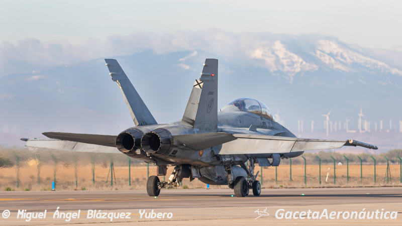El mecánico desconecta el umbilical que le permite comunicarse con los pilotos y a partir de ese momento el avión indica a la Torre de Control de Zaragoza que está listo para rodar. “Ebro 71 autorizado a rodar desde parking Ala 15 hasta Alfa 5”, el mecánico retira los calzos y el F-18 biplaza sale del shelter para rodar a la cabecera de pista. Los dos Toros salen también de otra de las filas de shelters y las tres siluetas se recortan sobre el Moncayo nevado. A los pocos minutos el estruendo de la postcombustión anuncia que los tres aviones se dirigen ya a la Delta 104 para realizar la misión programada. Durante una hora aproximadamente la calma vuelve a reinar en la plataforma del Ala 15.