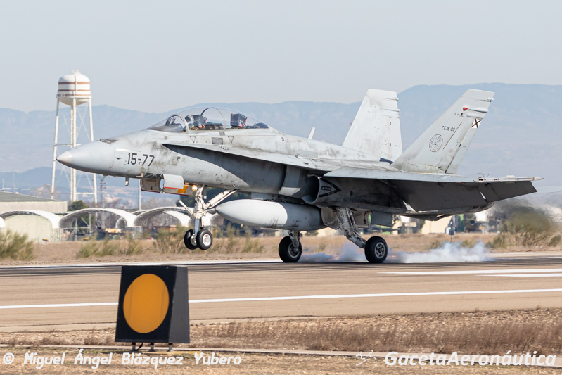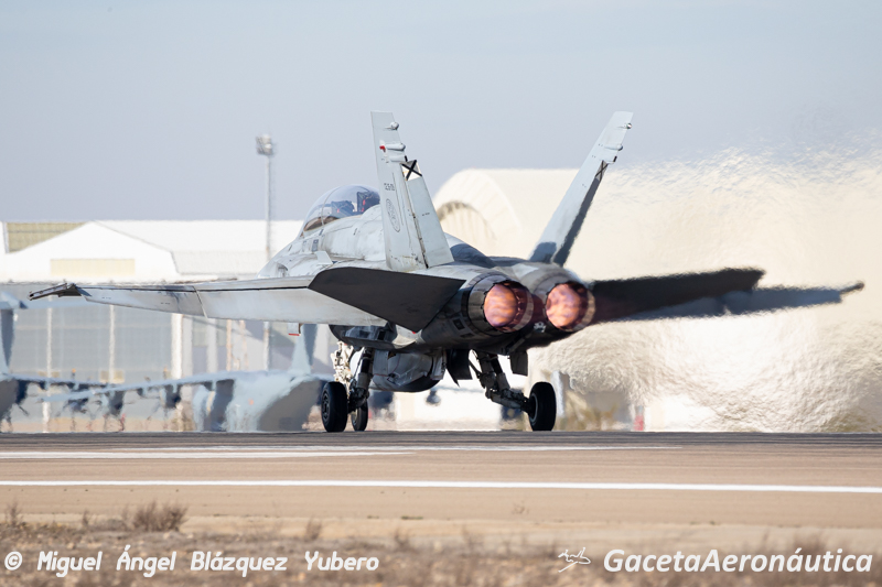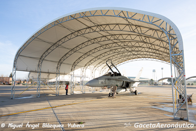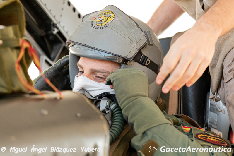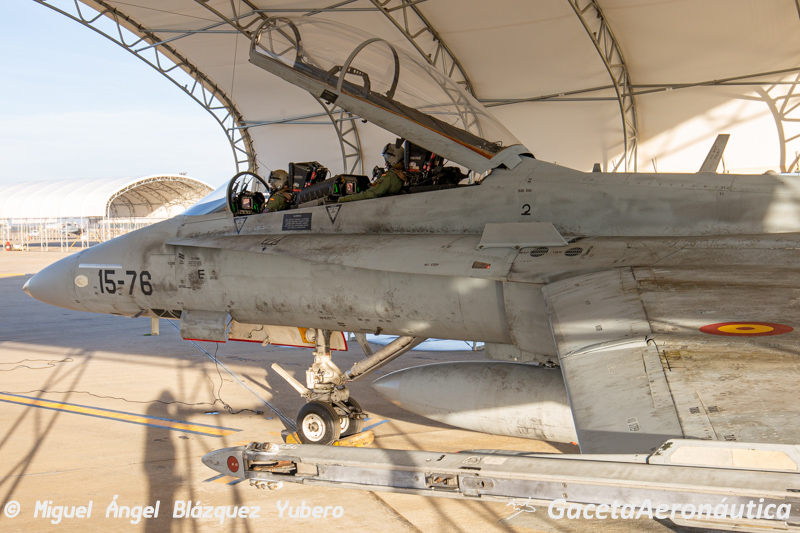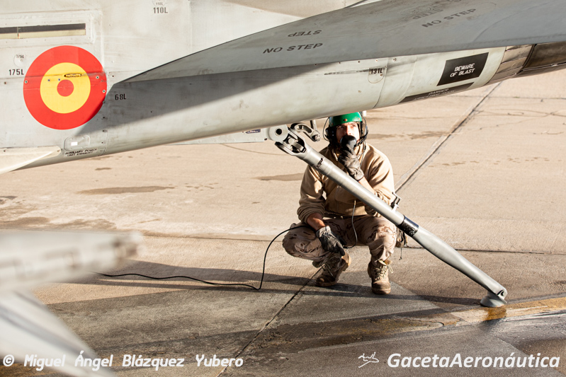 En el parking un EF-18BM biplaza está esperando bajo el shelter de protección, dos suboficiales, un Mecánico y un Armero de Línea están preparados para lanzar el avión. Tras la inspección visual exterior de la aeronave los dos pilotos se ponen el casco y trepan por la angosta escalerilla integrada bajo el LEX del F-18, no se puede negar que es un avión concebido para operar desde portaaviones.