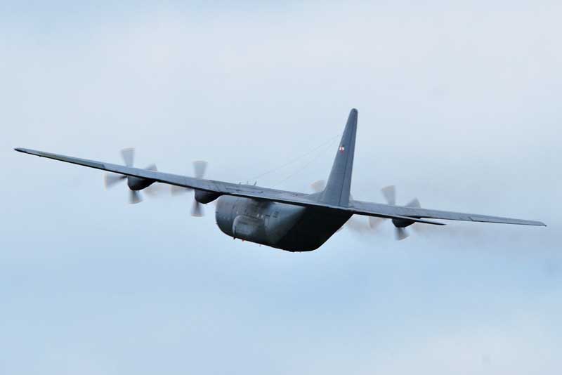 Seguidamente un Lockheed C-130B Hercules del Escuadrón Aéreo Nº 3 (Transporte) procedió a realizar el lanzamiento de paracaidistas y cuando estos ya se encontraban en tierra realizó un pasaje rasante.