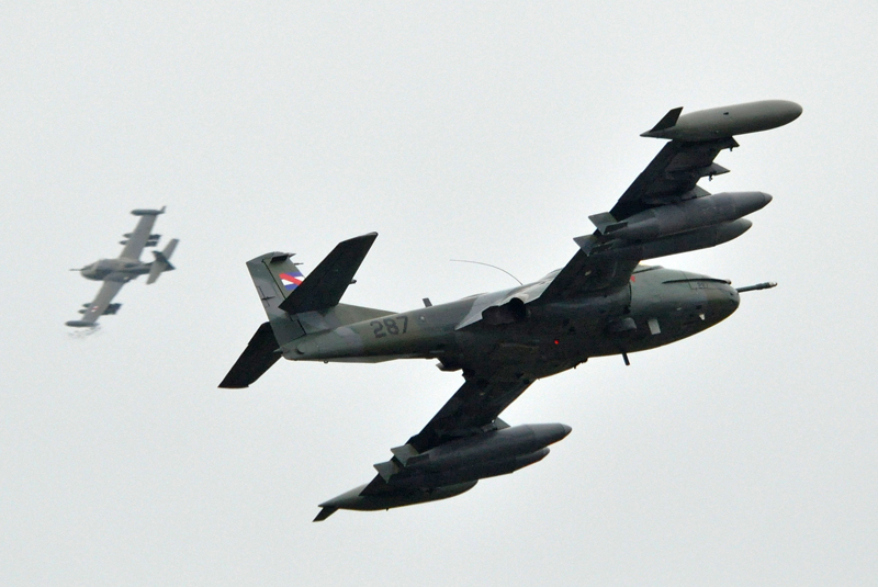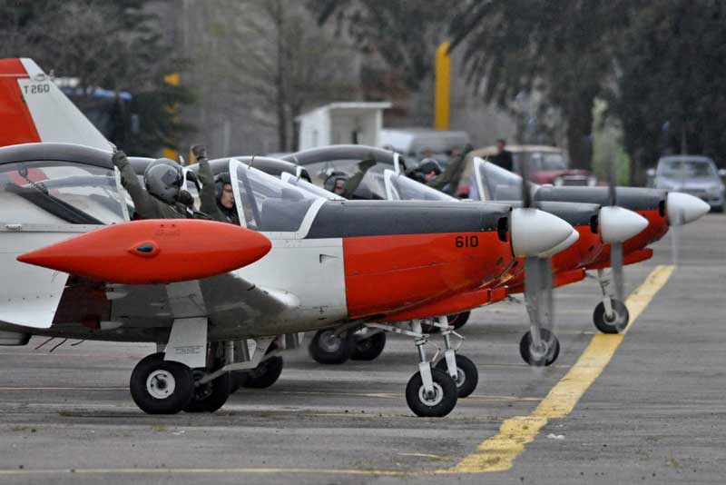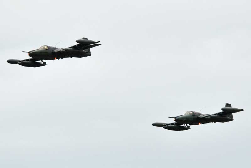Luego fue el turno de una sección de Cessna A-37B Dragonfly, localmente conocidos como “Alfas” pertenecientes al Escuadrón Aéreo N° 2 (Caza) que evolucionaron sobre la EMA realizando distintas maniobras y pasajes a baja altura en solitario y en formación.