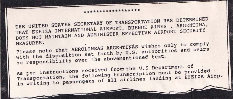 El 13 de marzo de 1992 el Departamento de Transporte norteamericano pidió a las aerolíneas de su país que informaran a sus pasajeros que, de acuerdo con las normas de la OACI, el aeropuerto de Ezeiza no era seguro frente a atentados terroristas. La reacción fue que todos los pasajes emitidos desde Estados Unidos hacia la Argentina tuvieron un volante adjunto que alertaba sobre la situación.