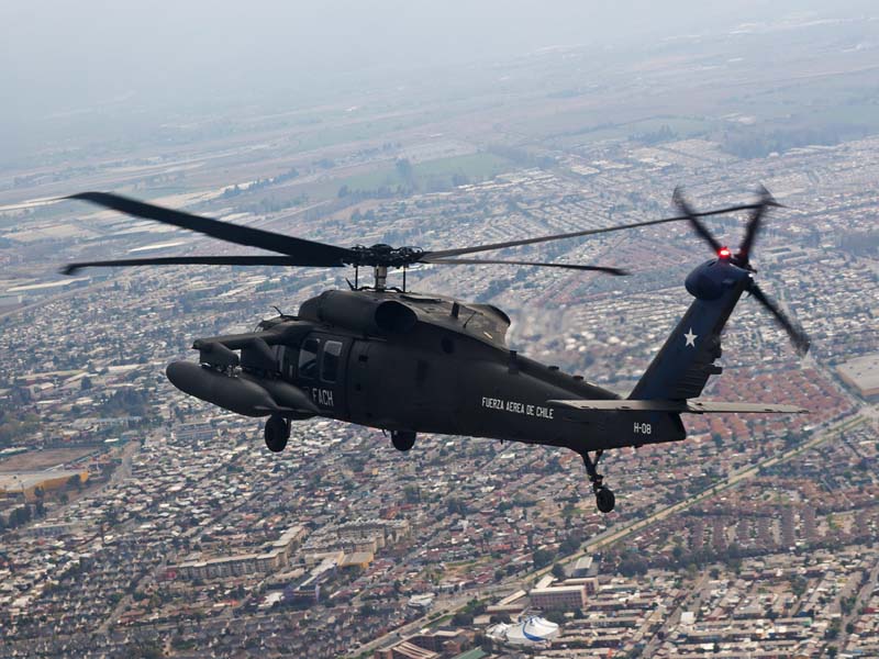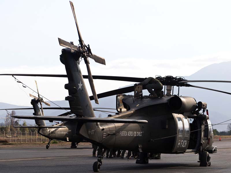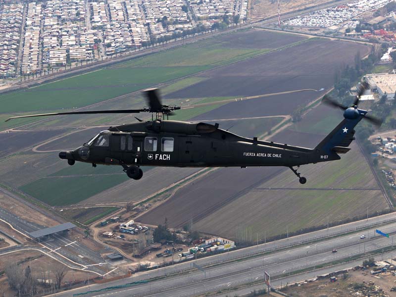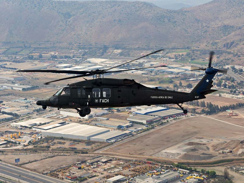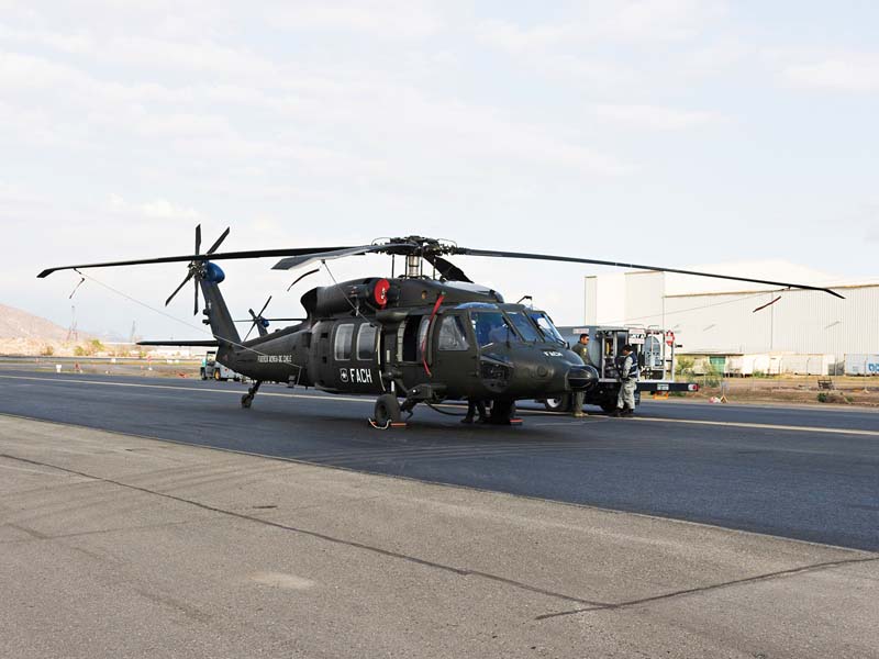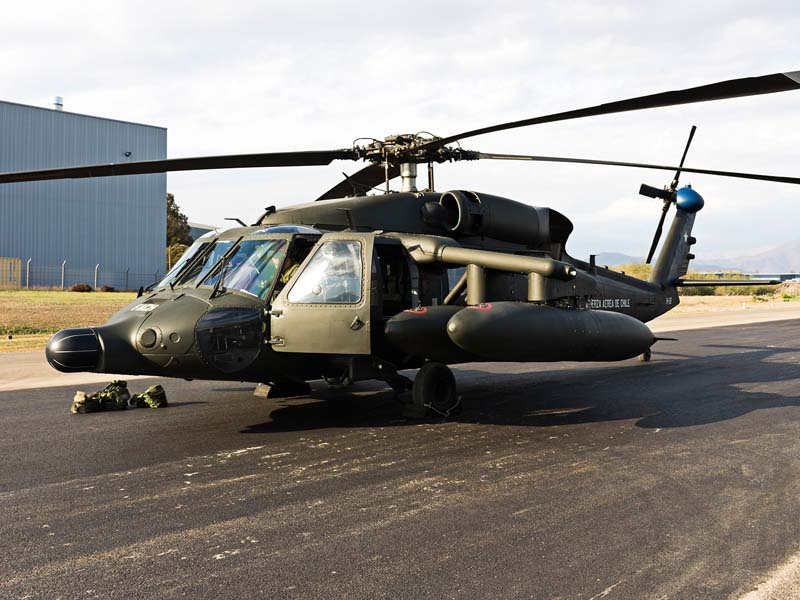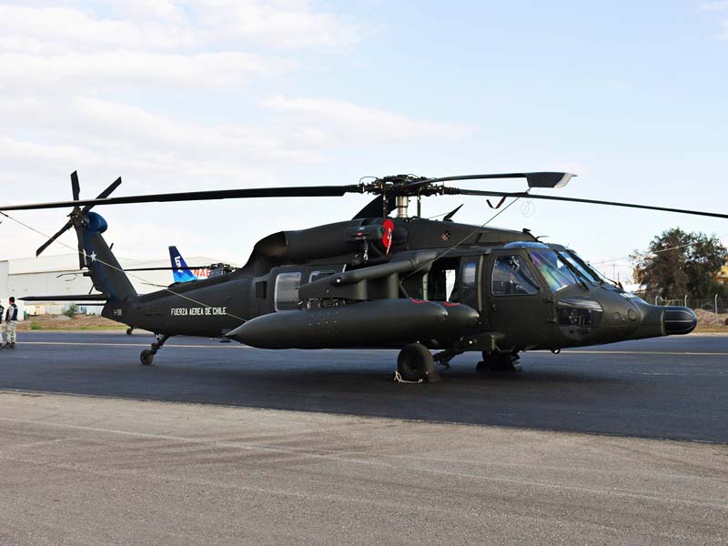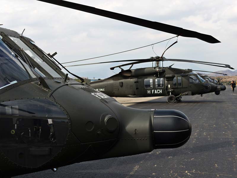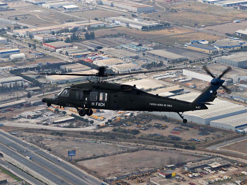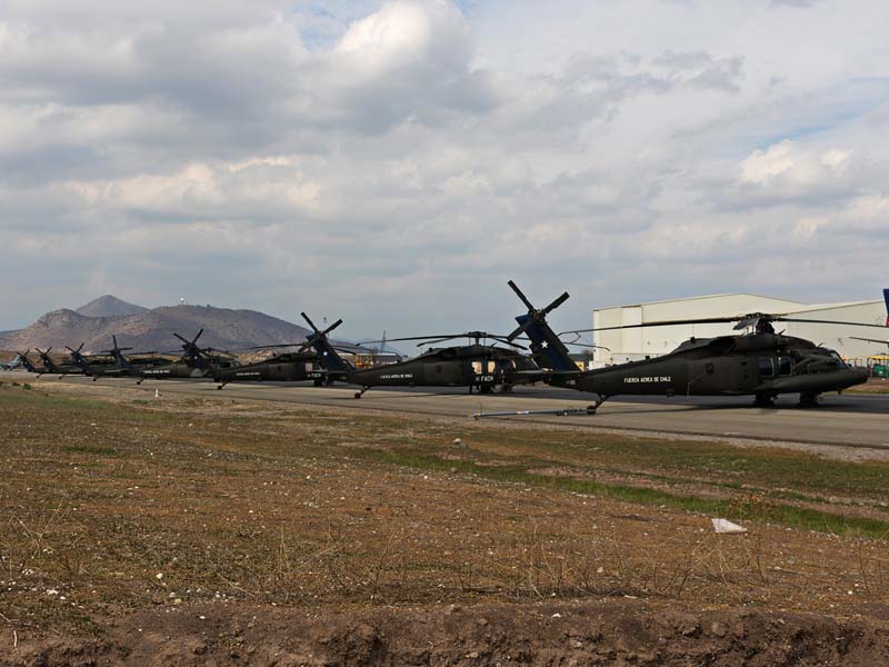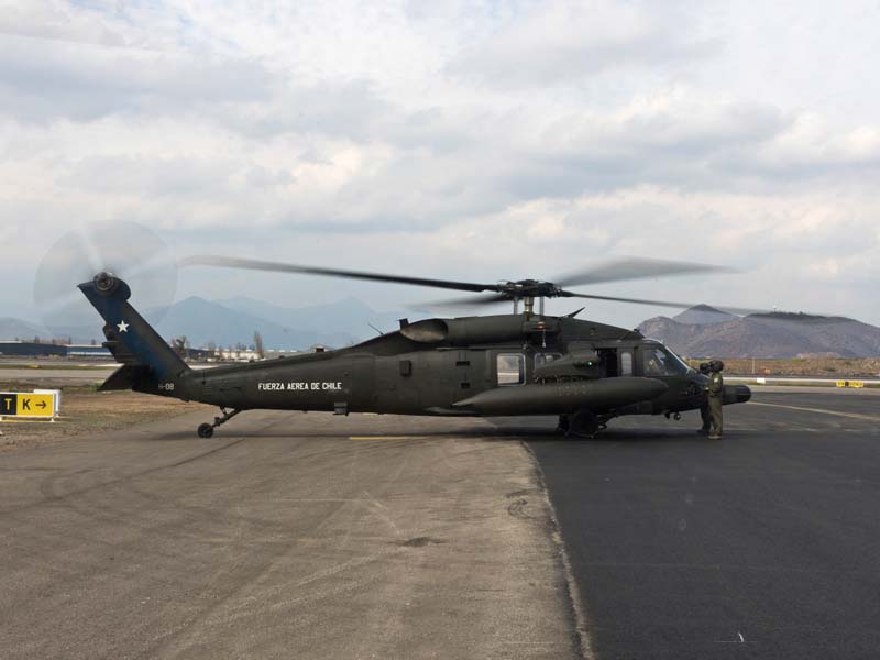 Arribado a la Base Aérea Pudahuel, faltaba saber aún en qué tipo de aeronave volaríamos sobre el parque O´Higgins. Si bien en años anteriores se habían presentado formaciones incluso con los 4 modelos de helicópteros mencionados, en la preparatoria del desfile de este año solamente se habían presentado Bell UH-1H y Sikorsky Blackhawk (dos de cada uno). Esperando en la sala de embarque del Grupo N° 10 de transporte al resto del grupo de invitados que volaran en esta oportunidad (canales de TV y fotógrafos de otros medios), nos confirman que seremos parte de uno de los hitos en la presentación de la FACH en esta parada militar ya que por primera vez volarán juntos, 6 helicópteros Sikorsky Blackhawk. Una vez que llegamos a la pista de rodaje “Tango” vemos alineados los 7 Blackhawk que posee la institución. A pesar de estamos con el tiempo ajustado se puede aún hacer una caminata entre ellos y tomar algunas fotos. Cuando las tripulaciones comienzan a dirigirse a los helicópteros me señalan que estoy asignado al H-03. Este es un helicóptero de los primeros 3 recibidos en julio del año pasado y externamente se distingue por tener instalado un Flir (visión delantera por infrarrojos) bajo el radar meteorológico. Estas son dos de las avanzadas características de estos aparatos, ya que el radar meteorológico les permite a los pilotos tener una ventaja de 1 hora de anticipación versus el pronóstico climático que se les entrega antes de comenzar una misión, y en vuelo es vital sobre todo en zonas cordilleranas. Por su parte el Flir le permite una navegación segura en condiciones nocturnas apoyado con el uso de lentes de visón nocturna(NVG , Night vision goggles).