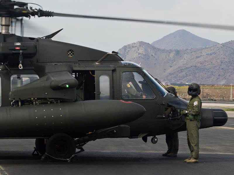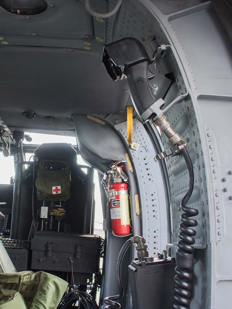 Hoy, los pasajeros somos 4 y procedemos a sentarnos en los asientos que nos indican, nos abrochamos cinturones y a esperar. Los dos tripulantes ahora están frente al aparato y le dan a la escena un toque tipo «Star Wars» ya que están equipados con sus cascos de protección balística (ABH) modelo HGU-56/P incorporados hace pocos años. Son las 15:45 y las aspas del rotor principal comienzan a girar, por lo que rápidamente se hacen obligatorios los fonos que nos entregaron con lo que la comunicación de los pasajeros se reduce a señas. Después de unos 10 minutos comenzamos a movernos. El líder de la formación es el comandante del grupo de aviación Nº 9, Comandante De Grupo (A) Rodrigo Zeballos que va a bordo del “H-08″ el cual porta los 4 estanques de combustible que le permiten a este modelo aumentar su alcance de 560km a 1600km pudiendo así unir en un solo vuelo sin escalas Santiago y Coyhaique a una velocidad crucero de casi 300km por hora.