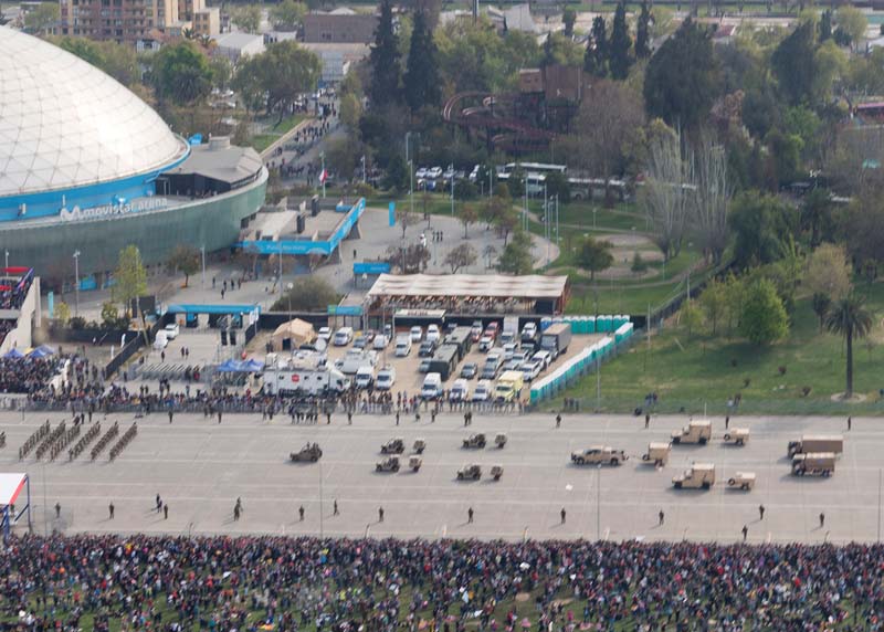 Despegamos cruzando la pista 17L de Arturo Merino Benítez y tomamos dirección hacia el nor-oriente, donde una vez llegado a la comuna de Quilicura comenzamos a hacer circuito de espera. A nuestro costado derecho va el H-07 y detrás nuestro el resto de la formación. Y así nos mantenemos por unos 40 minutos girando una y otra vez. Cuando finalmente el controlador desde tierra indica empezar la aproximación salimos del circuito y enfilamos hacia el sur con dirección al Parque O´Higgins. En el trayecto alcanzo a divisar a la distancia al frente nuestro, la formación de 10 F-16 Fighting Falcon, y posteriormente sobrevolándonos, los 3 C-130 Hércules junto a dos 2 F-5E Tigre III. Así, siendo casi las 17:00hrs. Pasamos sobre la elipse del Parque a una velocidad de 100 knots y una altura de 150 metros, mientras en tierra desfila frente la tribuna oficial el escalón motorizado de la FACH.