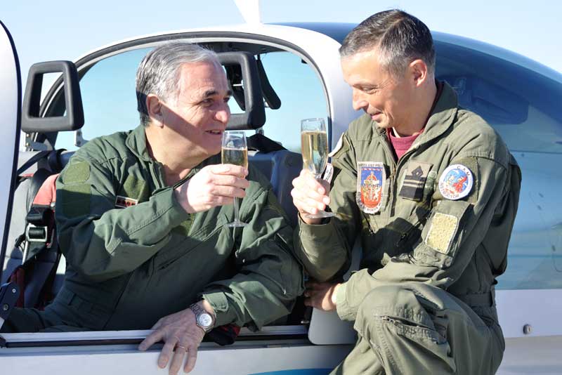 Teniente General “VGM” Bari del Valle Sosa brinda tras efectuar su vuelo en un Grob 120-TP. (Foto: Mauricio Chiofalo)