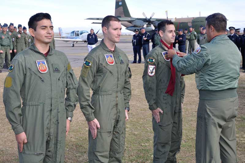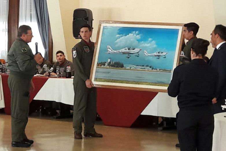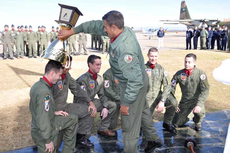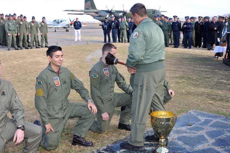 Como es habitual, tras realizar su primer vuelo solo, los oficiales cursantes fueron recibidos por sus camaradas con el tradicional manteo, tras lo cual realizaron un brindis con sus instructores y autoridades.