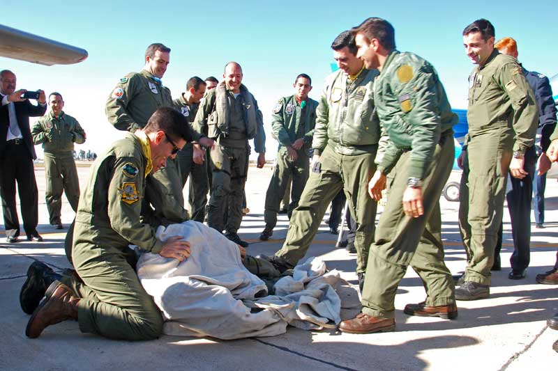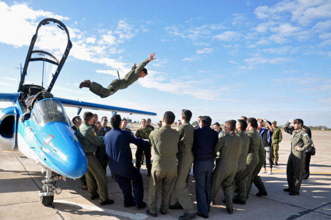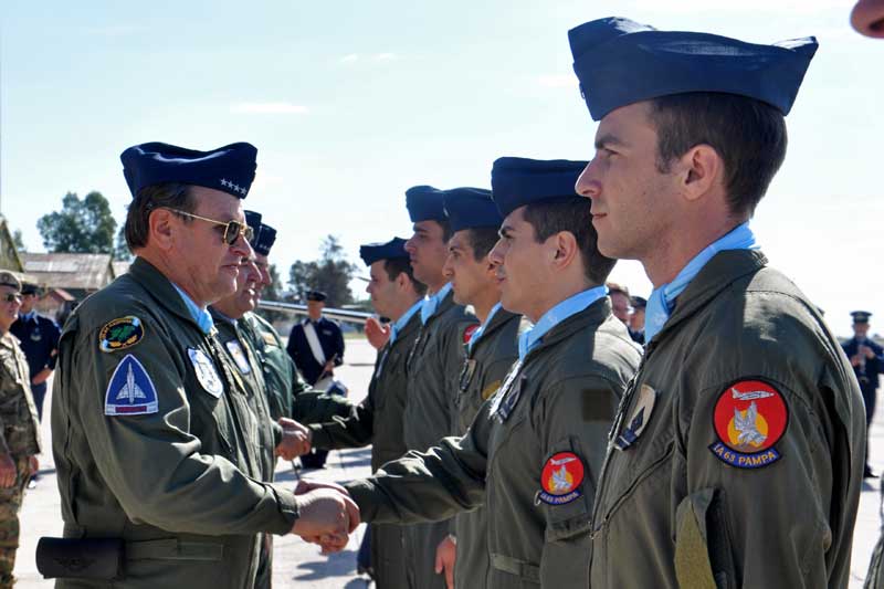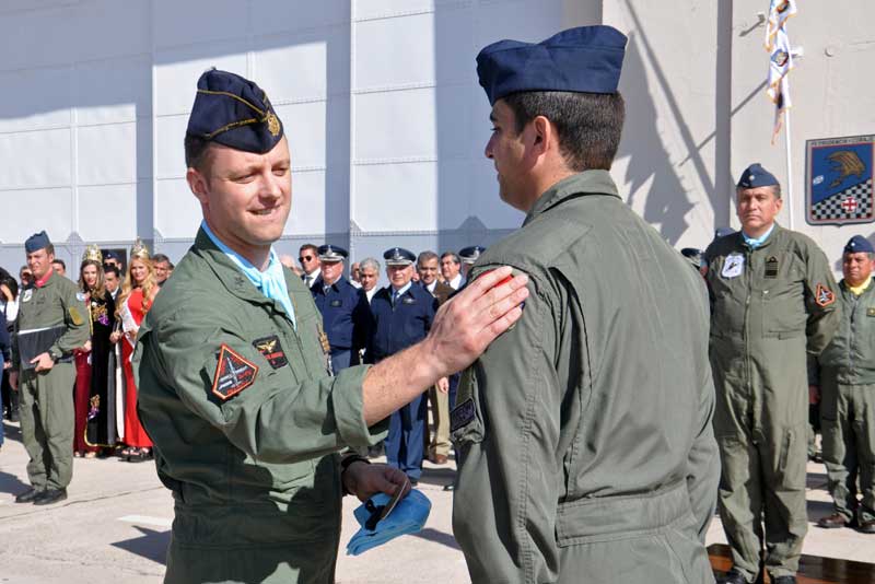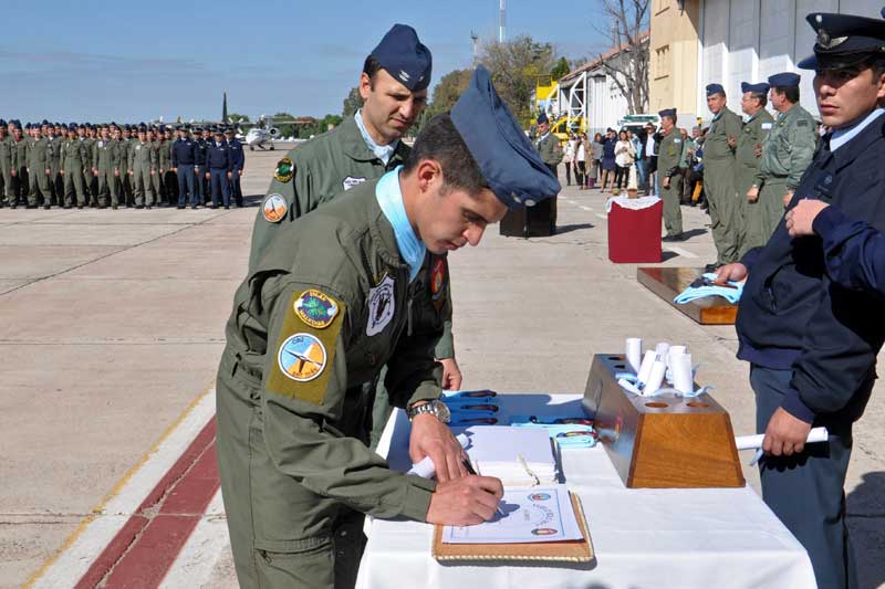 Celebremos este hecho hoy aquí, así como lo hicimos hace unos días en el Grupo Aéreo Escuela, y como seguramente lo haremos pronto con nuestros pilotos de Combate, de Transporte, con nuestros pilotos de combate de Helicópteros. Pero que la celebración se extienda desde la estación radar Tartagal a la Base Marambio y desde el Hospital Reubicadle en Haití, a la Unidad Aérea en Chipre, ya que la institución está viva, de pie y poniendo en vuelo a noveles pilotos que tendrán que hacerse cargo de un glorioso testimonio, porque deberán honrarlo en sus próximos años operativos.