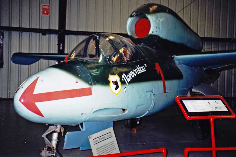El diseñador Ernst Heinkel, diseñó el Heinkel He-162 “Volksjäger” (Caza del pueblo), el cual tenía la particularidad de ser de muy simple y rápida construcción, debido a la urgencia del tercer Reich de tener un caza para la defensa de los ataques de los bombarderos aliados. Como dato, desde la firma del contrato, hasta la salida de producción del primer prototipo, solo se tardó 69 días, todo un record en la historia de la aviación. Otra innovación que se agregó a este avión fue la incorporación de un asiento eyectable, que el piloto podía accionar a 30 m de altura, en caso de ser derribado. Debido a problemas de estabilidad en los vuelos de prueba, se le agregaron unas aletas con diedro negativo, que solucionaron ese problema.